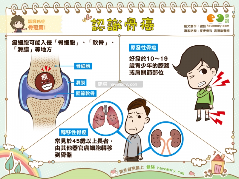 原發性骨癌,若發病於青少年族群而言,以惡性骨肉癌為常見,10~19歲是惡性骨肉癌的第一好發年齡層,多發生於膝蓋或肩關節附近,初期症狀為痠痛,尤其夜間的不適感更為顯著,而中後期症狀則是關節附近發生腫塊現象。