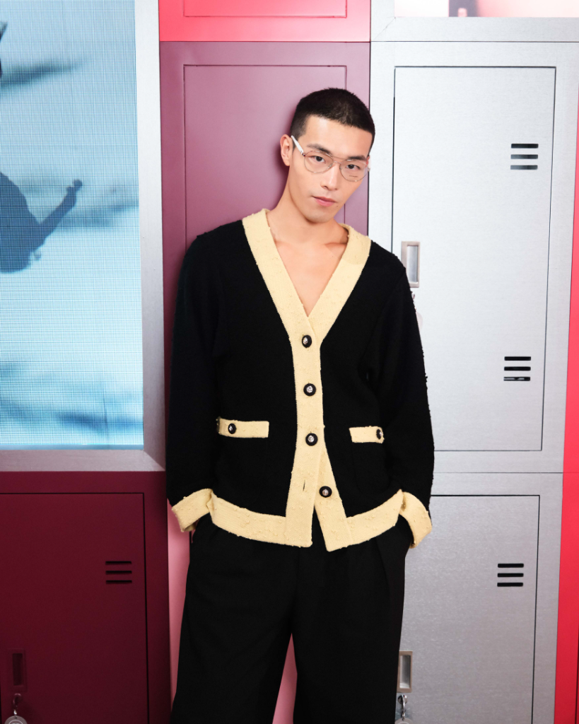 牧森這次出席活動,針織外套延續品牌經典的黑與奶油配色,但透過柔鬆剪裁與粗邊紋理,讓過往的「貴族氣息」轉為一種低調而有態度的時尚鬆弛感。再搭配透明飛行員眼鏡,則替整體風格添上一筆未來感,恰到好處地中和了外套的復古線條。從整體造型中可以感受到一種極有分寸的「輕奢美學」:不炫技、不用力,卻處處精緻,牧森表示「活動現場的佈置真的就是遊樂場,有滑板、有數位的拍貼機器很多元也很環保,最後還能到聽歌手現場表演也很幸福」。