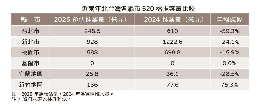 住展雜誌統計,北台灣2025年520檔期新成屋、預售屋預估推案量為1926.3億元,較去年實際推案量減少約718.8億元,年減幅27.2%。住展雜誌發言人陳炳辰指出,回顧近年該檔期,2020年的史上大降息,與2019、2024年的台股大幅走熱,讓建商推案可達兩千億元大關,但像2021到2023年,以及去年9月皆見政策干擾,包括2021年的房地合一稅2.0與預售屋實價揭露、2022年央行連續升息、2023年平均地權條例修法上路,和2024年9月的寬限期限制措施,再加上銀行房貸放款緊縮,都波動此檔期供給量,建商保守以對。