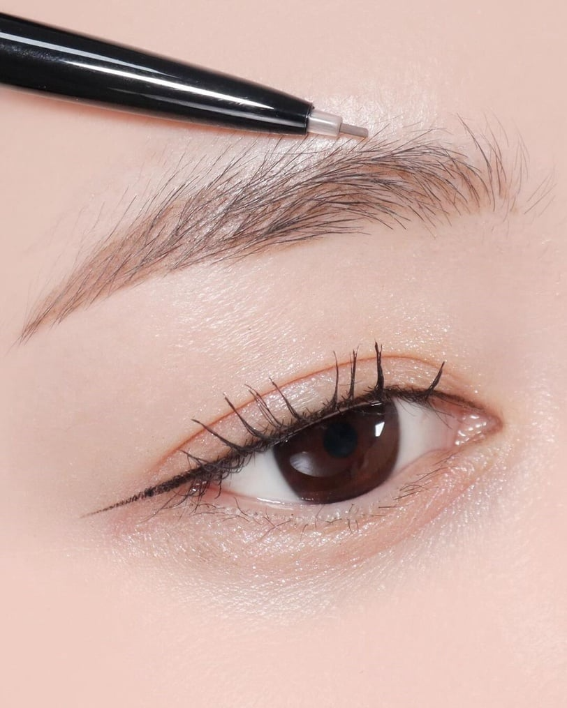 想畫出宛若天生的毛流,眉筆就需選擇跟毛流同樣細小的款式,筆頭建議選細的、刀鋒狀的,畫出來的毛流感更為自然!有了前一步驟的舖色,能更看見整個毛流走向與「缺毛」的地方,秉持「前淡後濃」的自然眉毛原則,補毛流時的順序為「眉毛中段—眉峰—眉毛前半段(不含眉頭)—眉頭補少許毛流」,都補完後,會發現眉毛相對整齊、有豐盈感了。