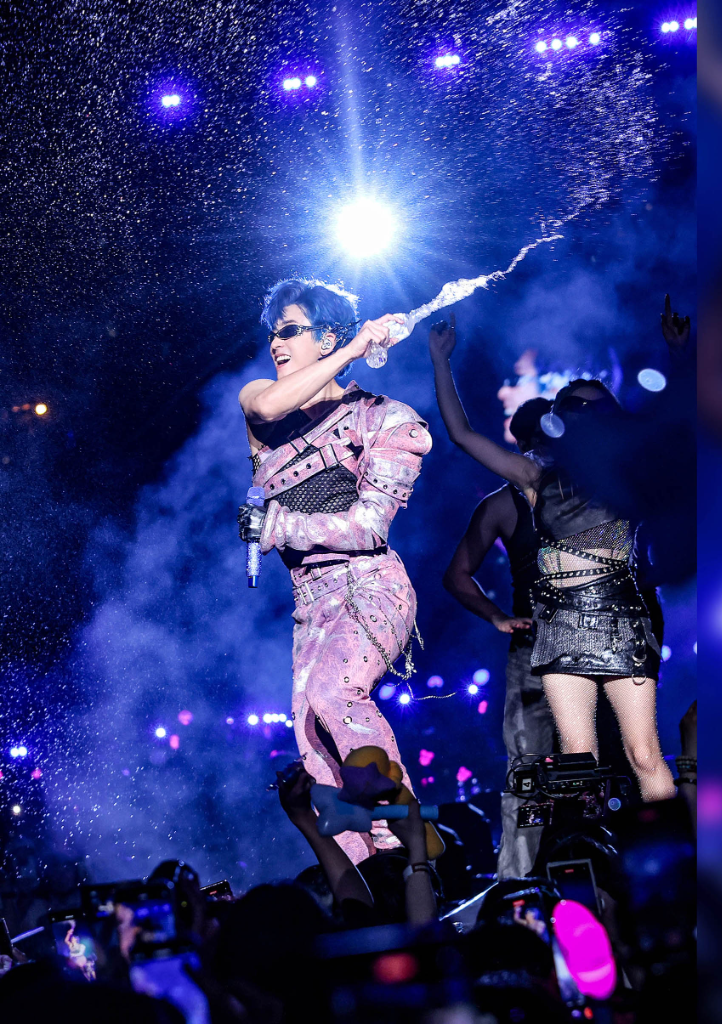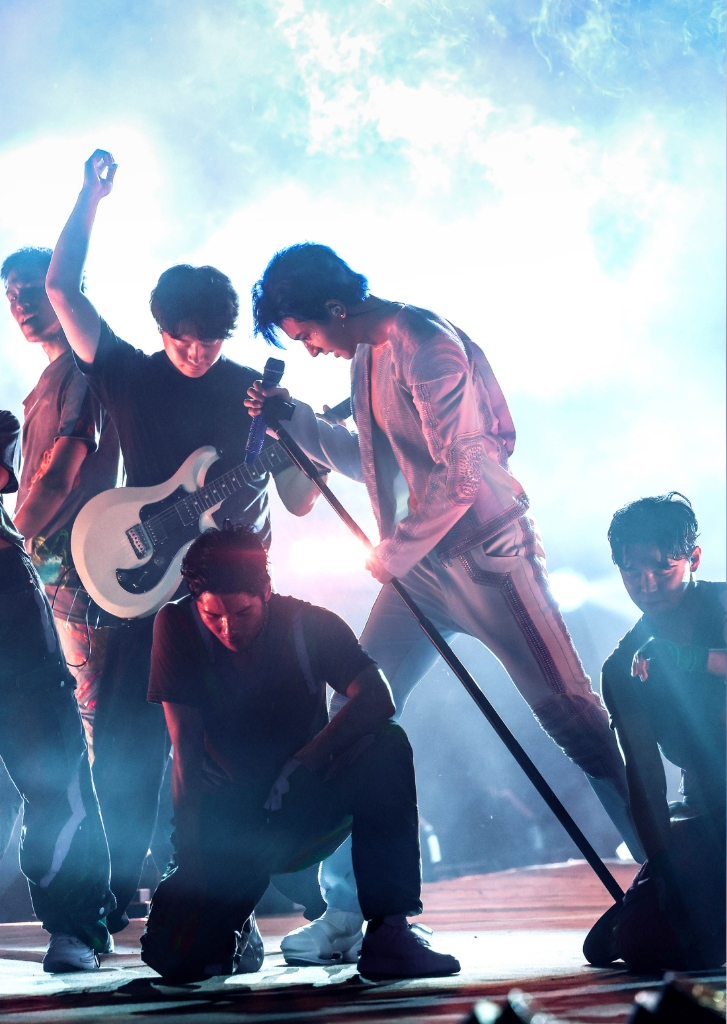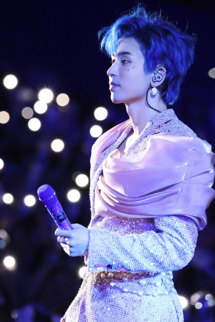 列印出漸變色晶體粒子,在舞台光折射下流光溢彩,帶領觀眾開啟一趟未知星球的漫遊體驗。隨著舞台燈光轉換,現場進入搖滾章節,張哲瀚身穿紫銀色金屬質感長袍,佩戴高訂墨鏡展現出極具爆發力的重金屬表演。當演唱完經典作品《曼陀羅》後,張哲瀚脫下長袍,黑色漁網透視背心加鎧甲鏈條造型更是引得全場尖叫,直呼:「張哲瀚我愛你~」「好性感啊啊啊!」