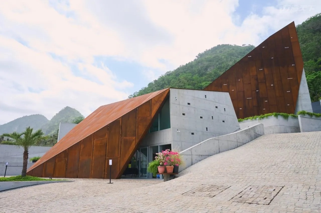 建築外型靈感同樣來自江賢二的鋼雕作品〈13.5坪〉,遠看宛如一顆順著山勢、座落於斜坡上的巨石。建築主體以清水模打造,屋頂採用江賢二喜愛的耐候鋼材,隨時間鏽蝕將呈現深邃紅棕色。設計亦借鏡原住民傳統石板屋智慧,以及厚實基座迎對颱風、地震等自然考驗。此處並展售以江賢二畫作為主題的海報與藝術文創商品。