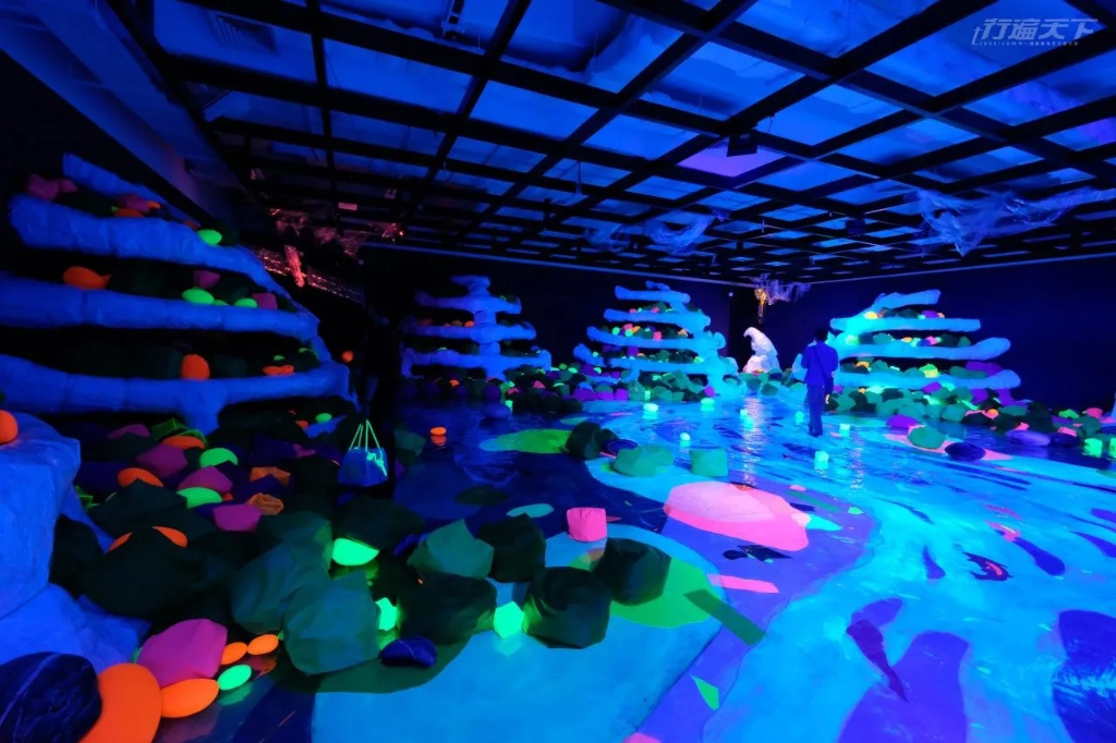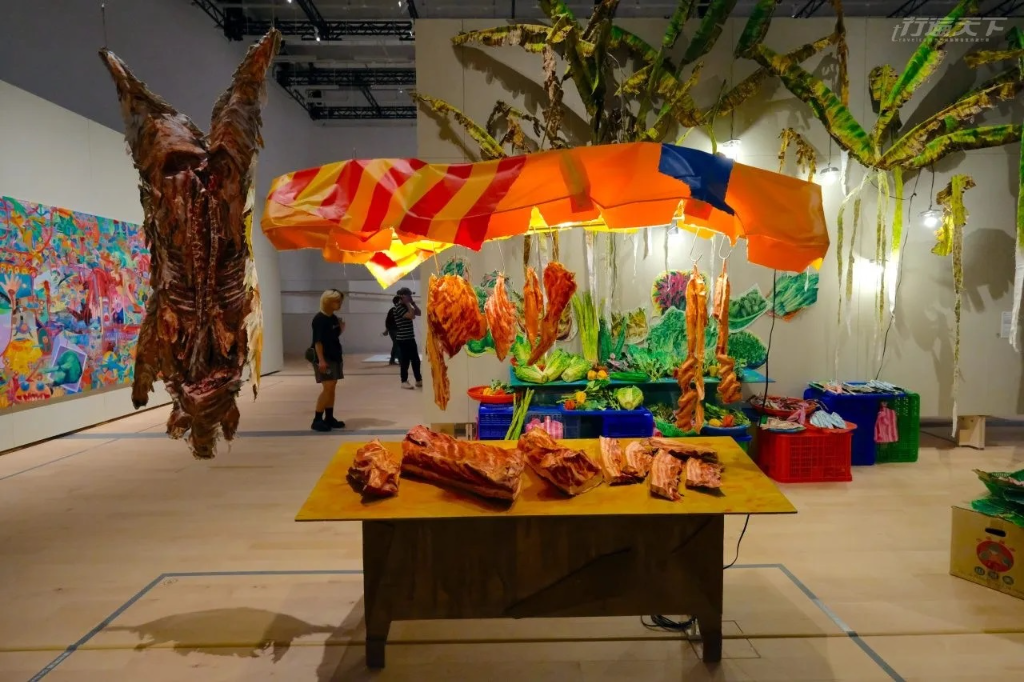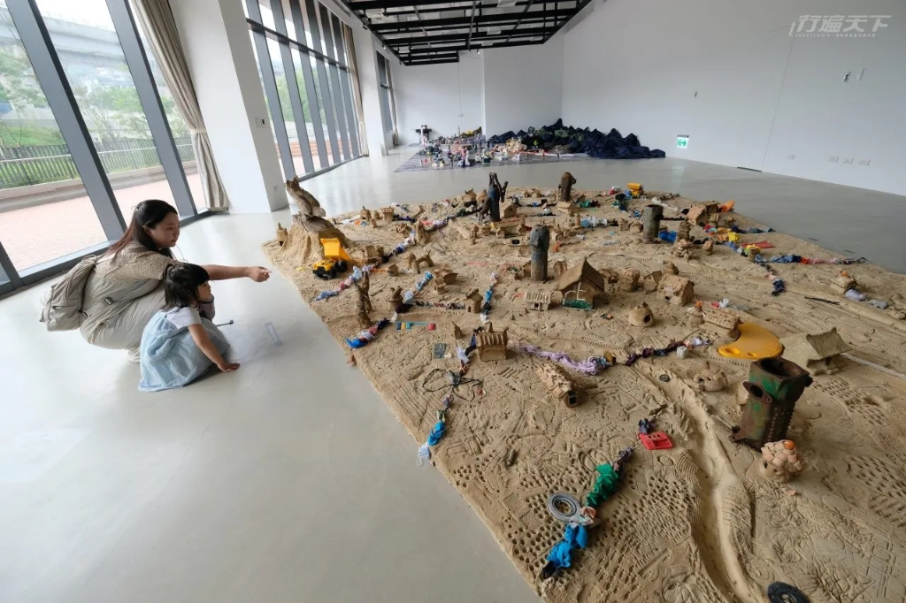 展覽透過虛實交錯與光影投射等媒材,呼應新北美術館與自然共構的理念。例如一座需脫鞋進入的霓虹暗室,地面映照出淡水流域的山水與魚群,營造沉浸式體驗;一件由回收破布拼貼的城市地貌裝置,則邀請觀者靜坐,從飛機繞行到台北101的剪影中細細品味。