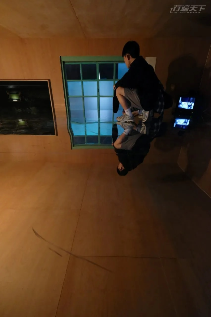 藝術家長期居住新店郊區,將對南勢溪流域的踏查經驗轉化為三面牆的沉浸式投影,讓觀者彷彿被吸入了河流中。展場內更設有虛實交錯的小屋,在無意識的電視播放下,人被矮窄天花板與玻璃地面共構的半虛半實空間裡,感受藝術作為療癒與逃避庇護所的空間感。