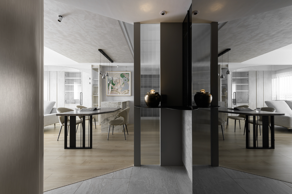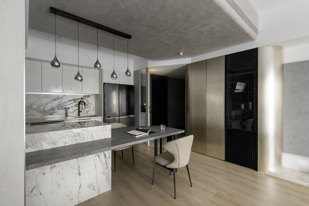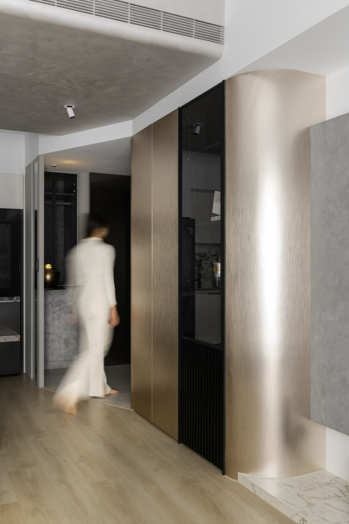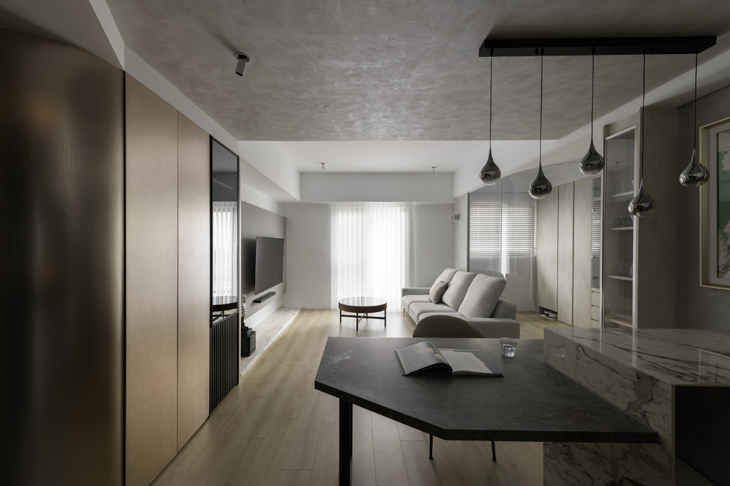 室內面臨入口動線與廚房位置重疊的特殊格局,設計師透過斜切手法,巧妙放大玄關區域,讓門口視覺流動更加順暢。斜切線恰好隱藏廚房空間,避免進門便見電器與雜物的共存的尷尬情形,再搭配曲面金屬櫃體,進一步柔化動線轉折,形塑輕盈通透感。