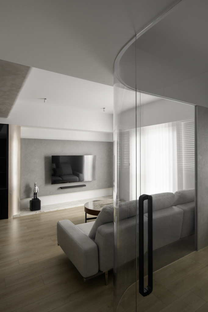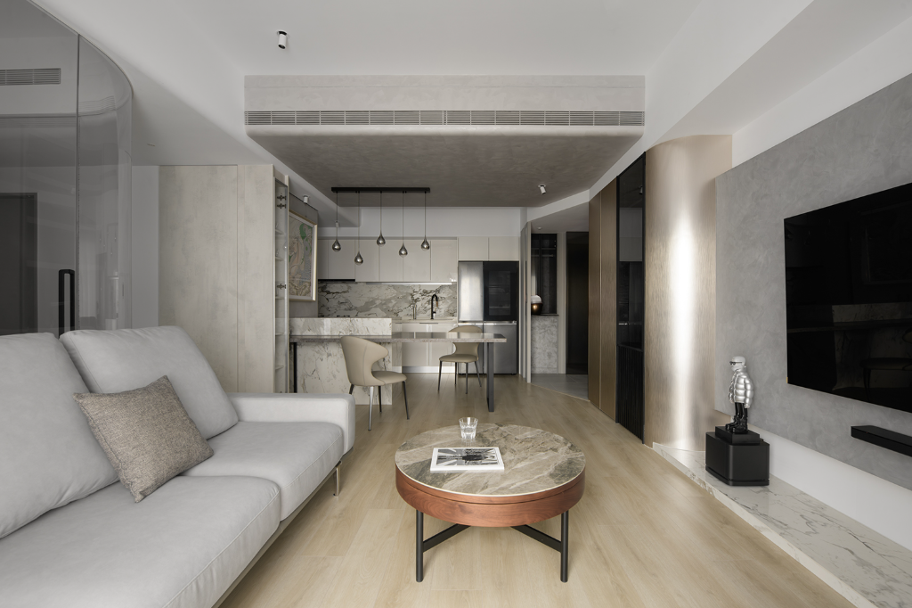 建材方面,設計團隊主要使用金屬板(波浪與毛絲面處理)、特殊塗料(如霧絨漆)、超耐磨木地板及少量石材。金屬板大面積應用於玄關曲面與局部收納,展現微光折射層次;霧絨漆用於天花與電視牆,帶來溫潤視覺感;木地板鋪陳於客廳與餐廳動線,兼顧日常使用與舒適腳感;石材則作為局部檯面點綴。並且全案貫徹環保永續理念,大幅採用耐久易維護的材質,大幅降低不必要材料浪費。前後陽台的對流使空間有效利用自然採光與通風,因此白天長時間不必開燈,不僅節省能效更可維持良好室內空氣品質。