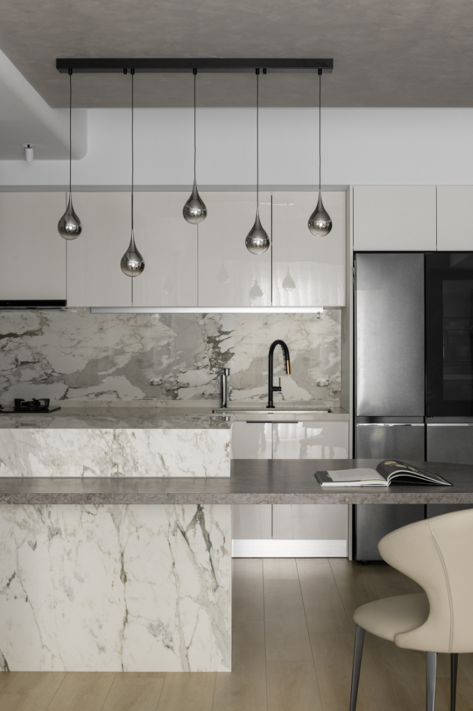 考量屋主重視社交與展示需求,設計師於是將最大巧思投放在餐廚公領域,其中最引人注目的是寬敞的中島,成為全家人聚會互動的核心。設計師運用「卡榫式」結構結合餐桌與中島,使備餐區與用餐區無縫融合。中島配置於空間中央,兼顧廚房與客廳間的視線交流;無論是烹飪或聚會,都能輕鬆遊走於動線中,創造「在一起」的高度參與感。中島與餐桌結合後,好友相聚或家庭派對變得更加便利,無論廚房備餐、孩子嬉戲、親友閒談,都能於同一場域裡輕鬆共享。