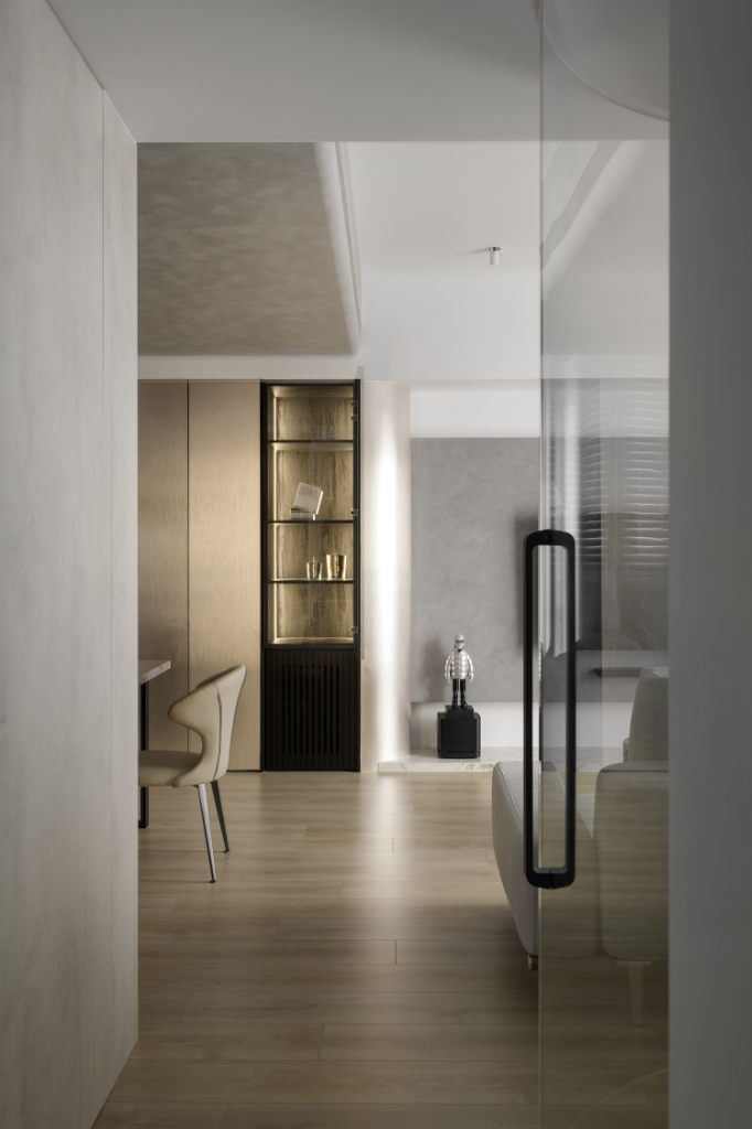站在玄關處,可見光線傾灑於中島,落在半透明玻璃隔間上,散發柔淨舒心氛圍;彎折線條與金屬光澤交織,讓人於日常中品味細微的美感。玄關斜切設計同時帶來寬裕進門視角與私密度,在有限空間創造舒適自在的使用體驗。玄關與廚房交會處的斜切,是精密的尺寸挑戰,必須確保家具家電能順利進出,畢竟差之毫釐則繆以千里。