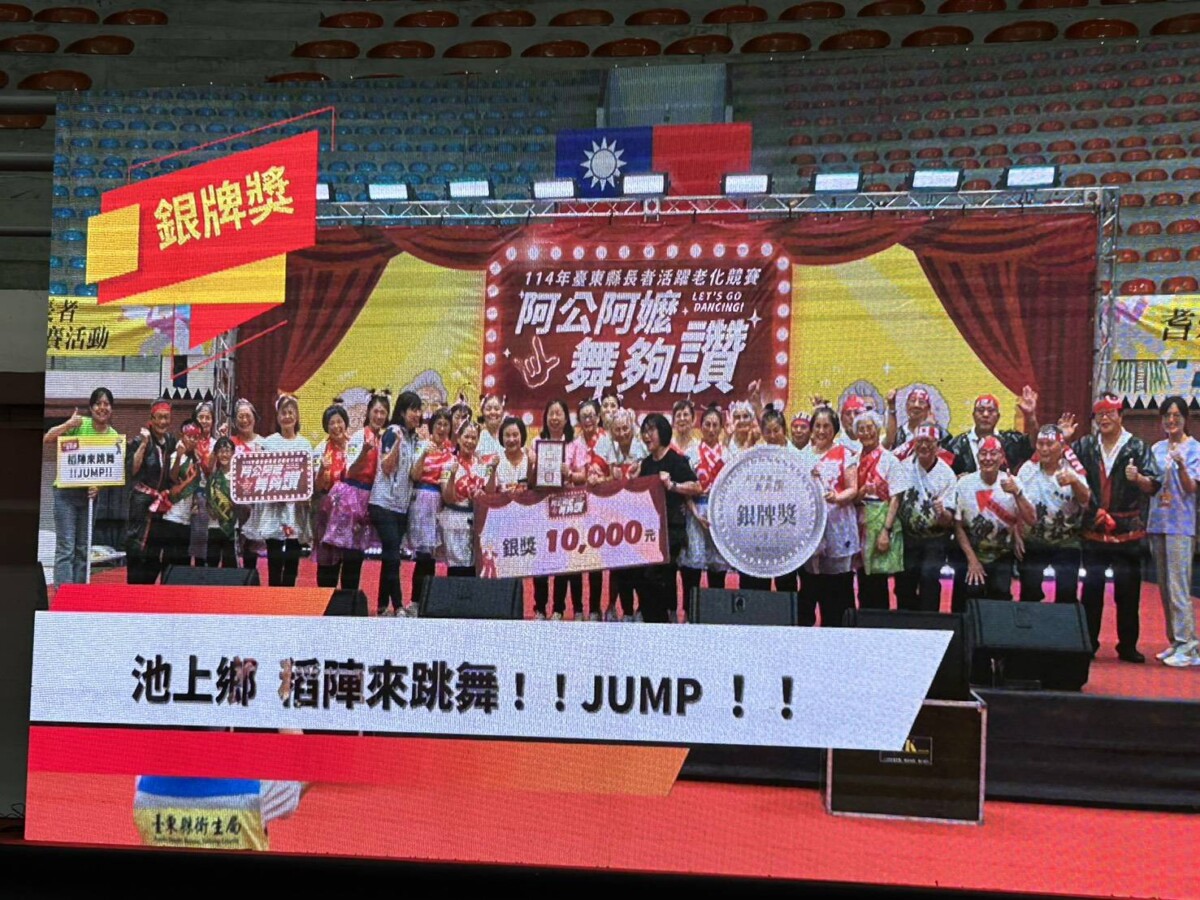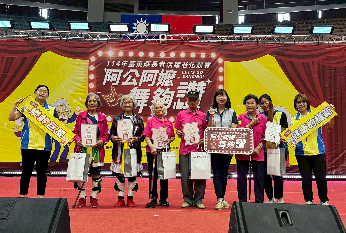 【記者 朱達志/台東 報導】面對超高齡社會的來臨,如何讓長者健康老化、活得有尊嚴、有品質,已成為當前社會共同的重要課題。為鼓勵銀髮族走出家門、展現自信與活力,臺東縣衛生局於今(23)日在臺東縣立體育館,舉辦了一場動感十足的「阿公阿嬤舞夠讚」臺東縣長者活躍老化競賽,共有300位長者來自8個鄉鎮市的社區代表隊齊聚一堂,以舞蹈、健康操和團呼的形式,展現樂齡風采與團隊默契。在激烈的角逐中,最後由「金峰鄉—台東縣金峰鄉賓茂社區發展協會」與「池上鄉—稻陣來跳舞!!JUMP!!」脫穎而出,分別榮獲冠、亞軍,並將代表臺東縣參加東區競賽。