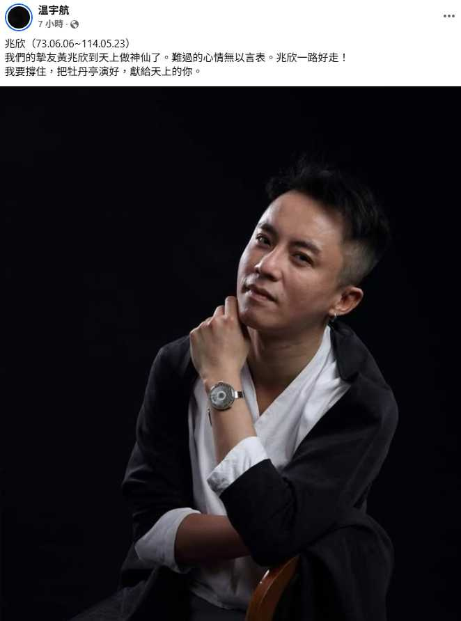 温宇航24日上午在臉書貼出與黃兆欣的照片,難過寫道:「我們的摯友黃兆欣到天上做神仙了。難過的心情無以言表。兆欣一路好走!」並提到自己會撐住,把《牡丹亭》的演出做好,獻給這位至交好友。貼文一出,不少戲曲界人士也在社群平台發文悼念,氣氛哀戚。