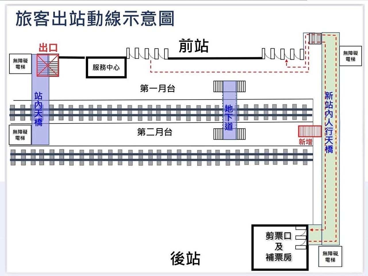 王美惠特別要求整座新天橋設計,應於第二月台位置增設樓梯,並保留無障礙電梯,確保旅客通行的需求;王美惠表示,針對前站北端的旅客需穿越整個車站,才能由南端出口離開車站的問題,經今日會勘協調,台鐵已承諾,將於前站北端增設一處出口,並將今年7月與天橋一併啟用,以方便行動不便者縮短動線,提升整體通行效率。