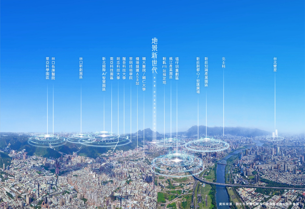 有塭仔圳跟北台灣AI廊帶環抱優勢的「地景新世代」,還有軌道經濟與交通優勢,距五泰輕軌F11站預定地只要步行250米,輕軌交通往北銜接環狀線三重士林北環段,可勾連輝達進駐北士科的火熱議題。