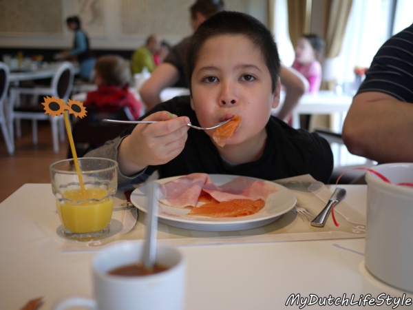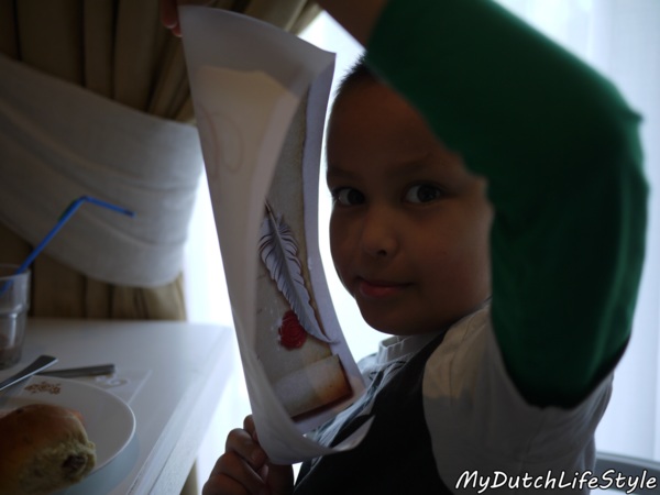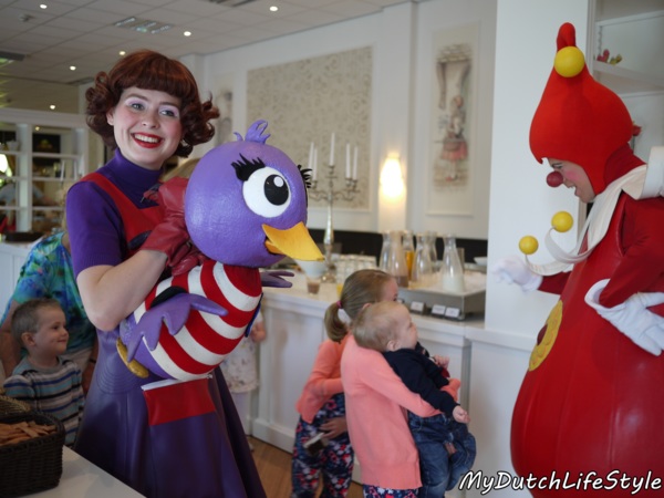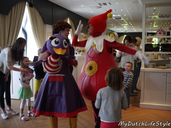 《早餐早點名,飯店內招牌人氣布偶Jokie & Jet一現身,如同吸童機,小朋友開心極了,歡樂面對面!》