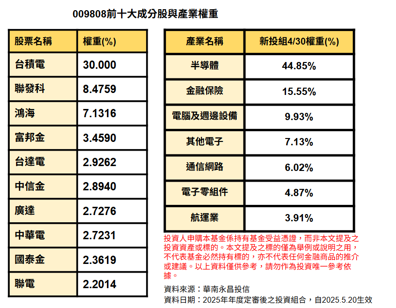進一步觀察臺灣護城河概念優選50指數產業權重(2025年4月),半導體產業權重達約44.85%,其次為金融保險權重為約15.55%,隨著半導體產業廣泛應用多領域,且AI更為近年熱潮,指數可望搭上科技趨勢,並於每年1次定期審核且持續進化,假設未來台灣國家主權基金推出,預期選股方向趨於一致,大盤將持續推升,009808也勢必將跟隨大盤持續讓更多投資人受惠。