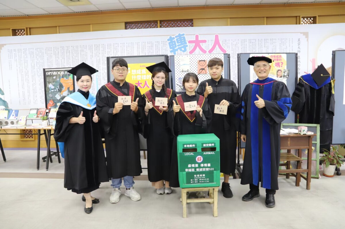 此外,圖書館亦設置「轉大人」專區,提供相關書籍與影音資料,協助學生深入了解步入社會與職場後的多元面貌。現場更設置「未來郵筒」,邀請學生寫明信片給一年後的自己,圖書館將於明(115)年6月代為寄出,讓學生在一年後回顧當時的心境,同時也能檢視自己的目標與理想,並能不忘初心實踐夢想。