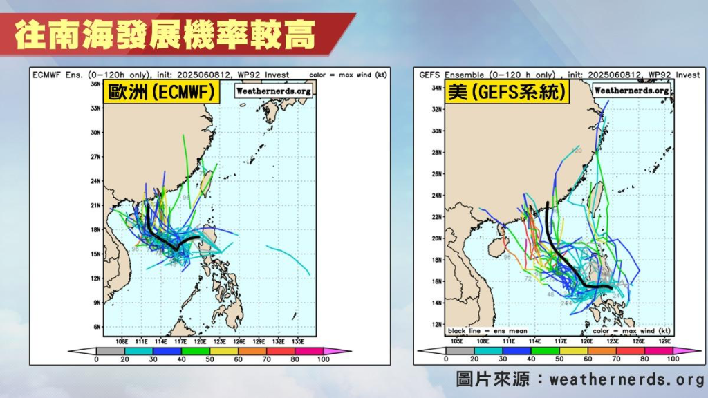 林得恩說,目前美國NCEP模式認為在6月10日至6月11日期間,南海擾動會再增強為颱風;歐洲ECMWF模式則認為強度維持在熱帶性低氣壓與輕度颱風之間。至於蝴蝶颱風路徑怎麼走?他指出,熱帶擾動將循環境駛流場的導引,「先往西北,朝海南島方向前進,後轉北、到東北,上中國大陸陸地,並在華南地區消散死亡;太平洋高壓幫了很大的忙!」