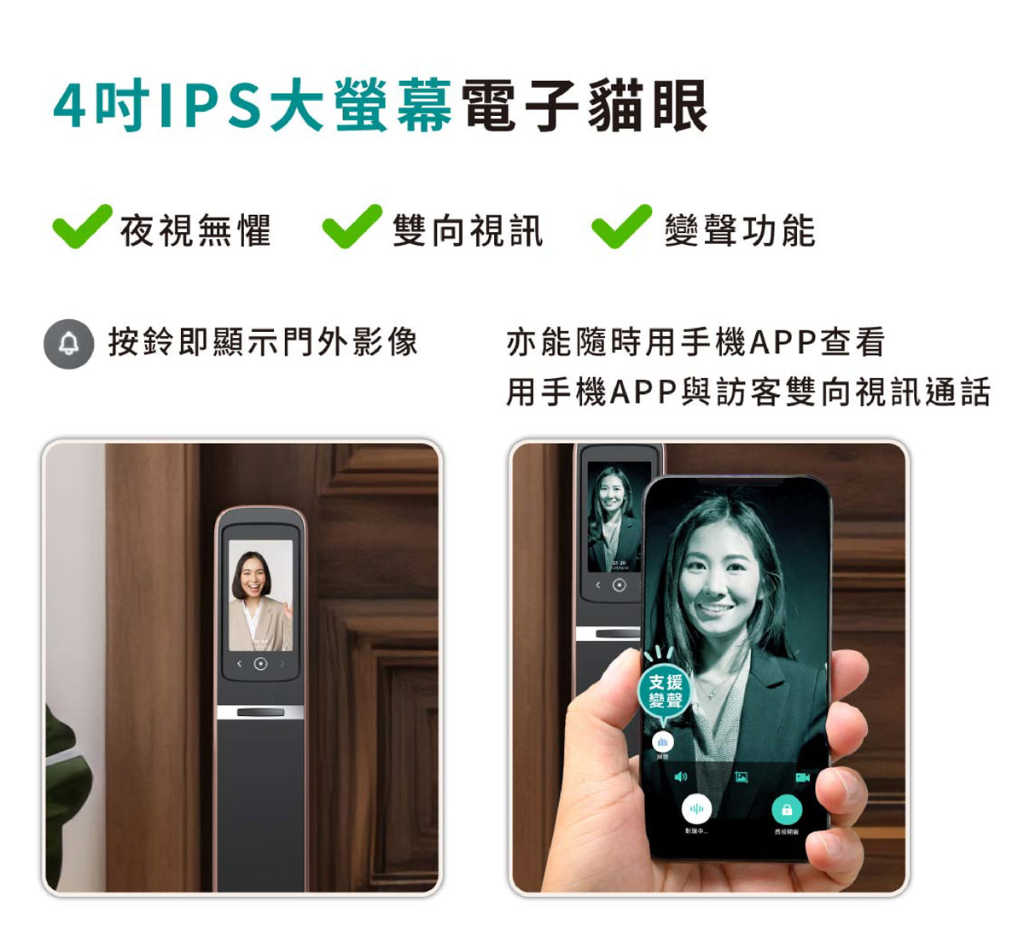 外出上班、旅遊時,也能透過App確認家門是否有異常人士逗留,並可遠端設定臨時密碼讓親友或外送員開門。