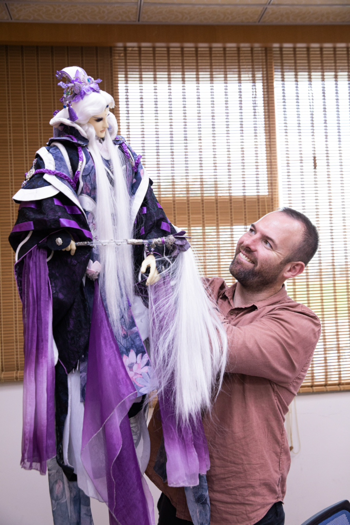 ▲ 南澳藝術總監約書亞•豪爾對於素還真戲偶非常有興趣,學習操偶愛不釋手。(圖:霹靂國際多媒體)