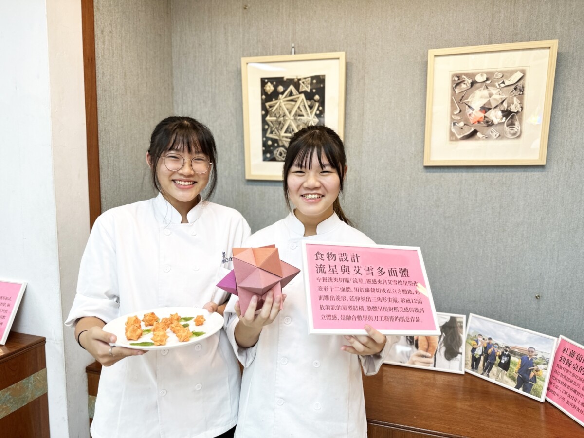 陳世傑表示,展覽作品件件令人驚艷,餐飲科學生石巧寧、鍾佩蓁結合幻視藝術,以蛋為媒材,模擬番茄、茄子等蔬果造型,創作出「蛋的擬態蔬果」,挑戰觀眾視覺感官。學生黃丞寧、黃冠澄以2023年發表的「愛因斯坦磚」(Hat tile)為靈感,融合數學邏輯與糕點藝術,製作能互動的薑餅拼圖。