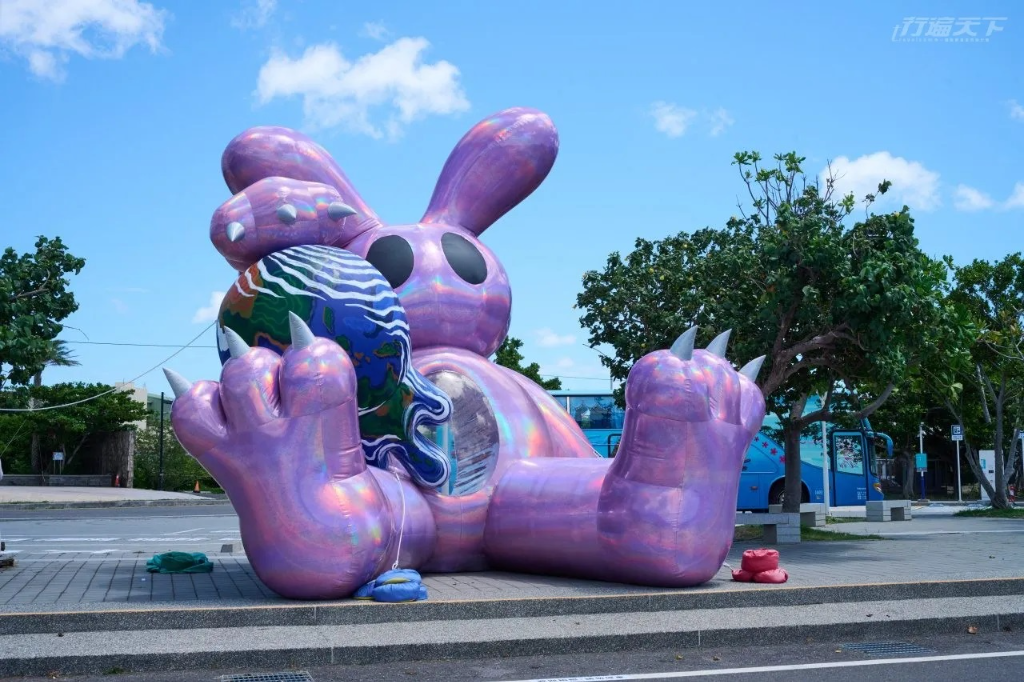 日本新普普藝術家ABEYUKA.阿部有加在2023年特展《華麗的綻放》中推出,有高達6公尺華麗貪吃的怪奇萌兔閃耀著絢麗色彩,搭配港口的藍天白雲,又怪又喜愛。