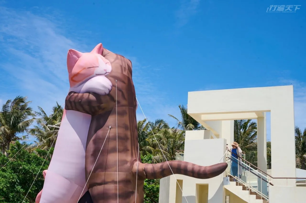 2024年曾在看海美術館旁的《極度日常》展覽中亮相,這兩隻緊緊相擁的可愛貓咪風靡南台灣,如今再度現身港邊,位置略移至大樹旁。由日本藝術家花房櫻創作的14公尺「擁抱貓咪」,無論從哪個角度看都同樣療癒可愛。