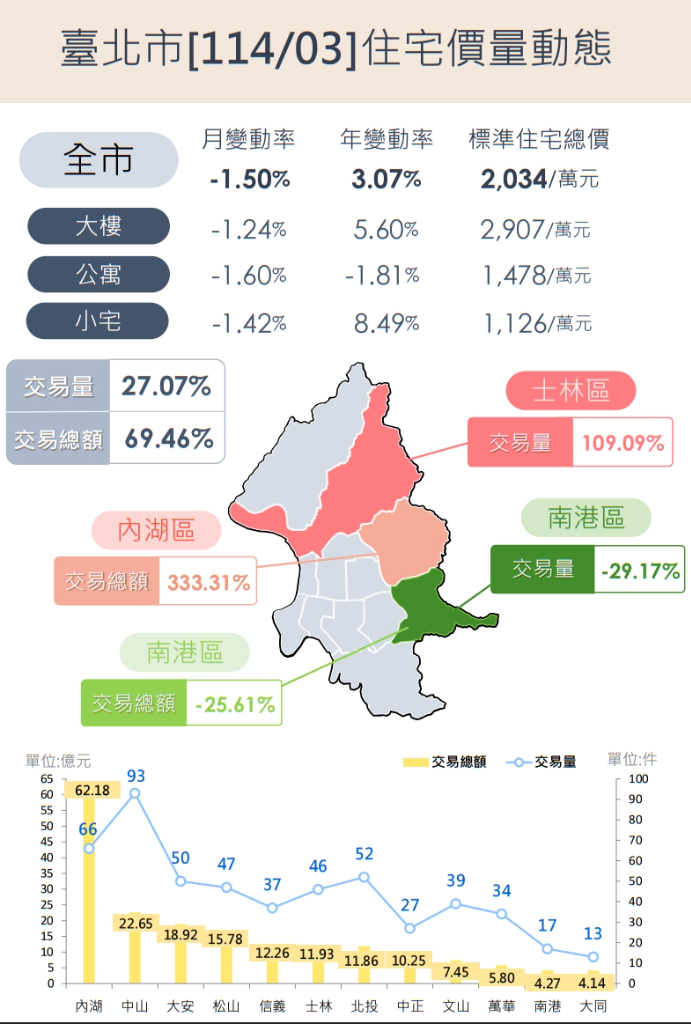 根據今(2025)年最新實價登錄資料,台北市3月房市交易量及交易總額,皆較2月明顯回升,但住宅價格指數則小幅下滑,顯示房市量增價跌的趨勢。