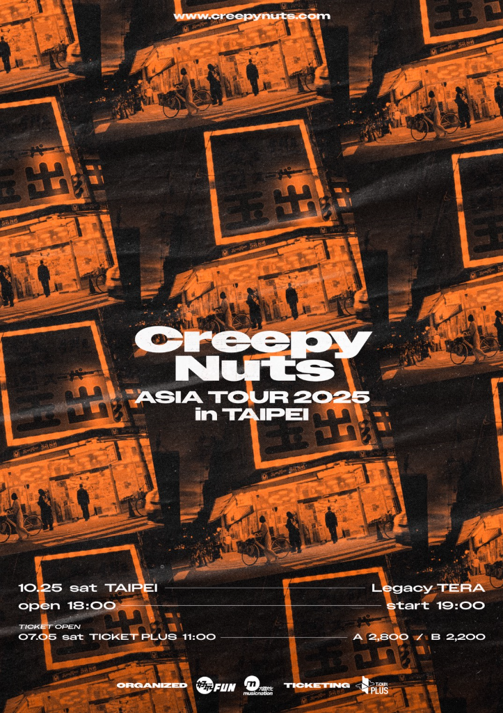 日本嘻哈雙人組合 Creepy Nuts ,將於10月25日(六) 在 Legacy TERA 舉辦他們的首次台灣專場演唱會「Creepy Nuts ASIA TOUR 2025 in TAIPEI」。這組由饒舌冠軍 R-指定 與世界級 DJ 冠軍 DJ 松永 組成的黃金拍檔,將帶來一場充滿爆發力與感染力的現場演出,門票預計於 7月5日(六)上午11:00 在 遠大售票系統正式開賣。