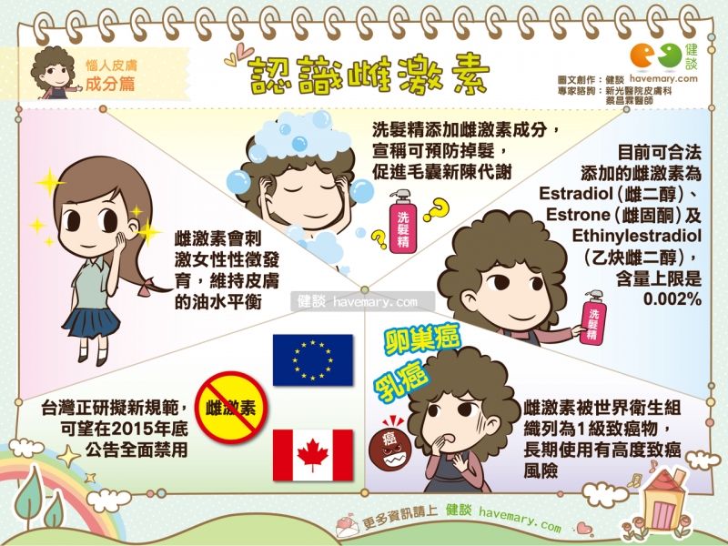 然而,雌激素已被世界衛生組織(WHO)列為一級致癌物,長期使用可能增加乳癌、卵巢癌、子宮內膜癌的致癌風險;若孩童長期接觸,也可能出現性早熟、影響性徵及生殖功能。因此,歐盟、東協、加拿大等多國已禁止化妝品添加雌激素,台灣目前也正著手研擬新規範,評估將於2015年年底起,禁止保養品、洗髮精添加雌激素成分,為國人健康嚴格把關。