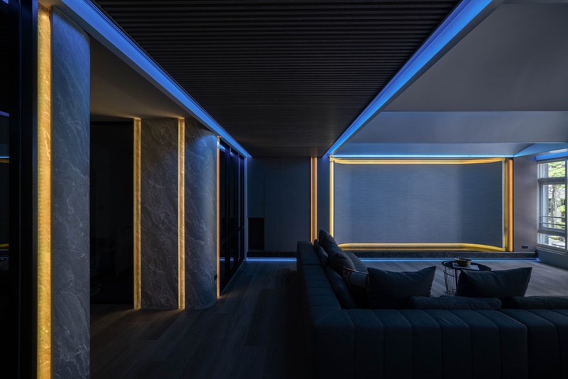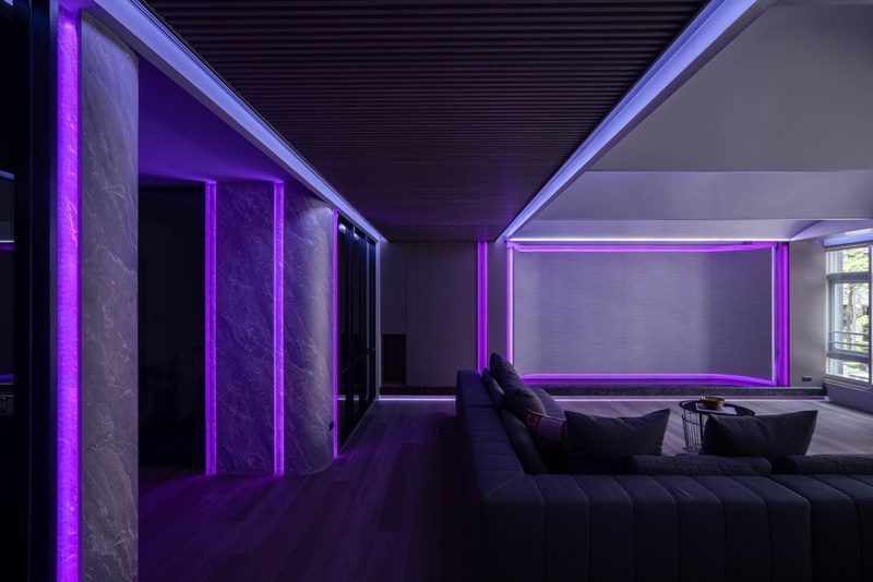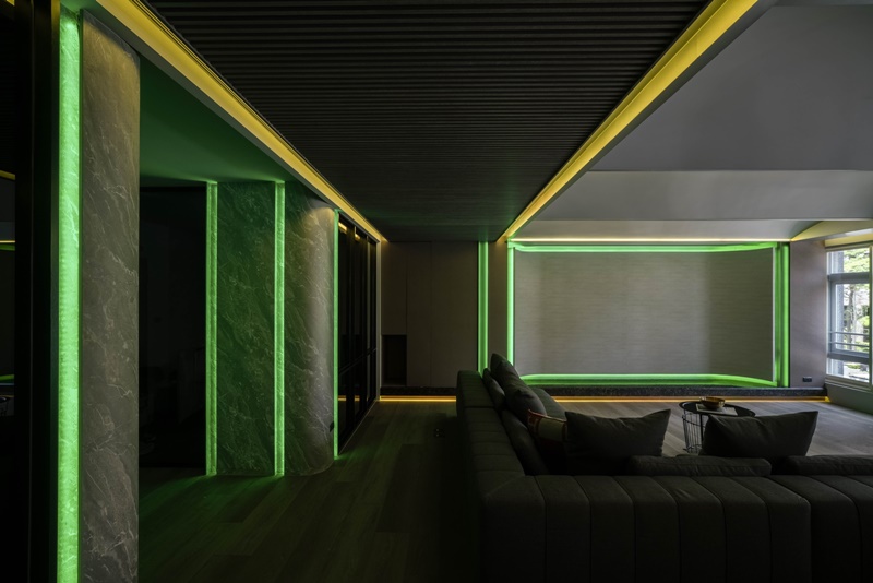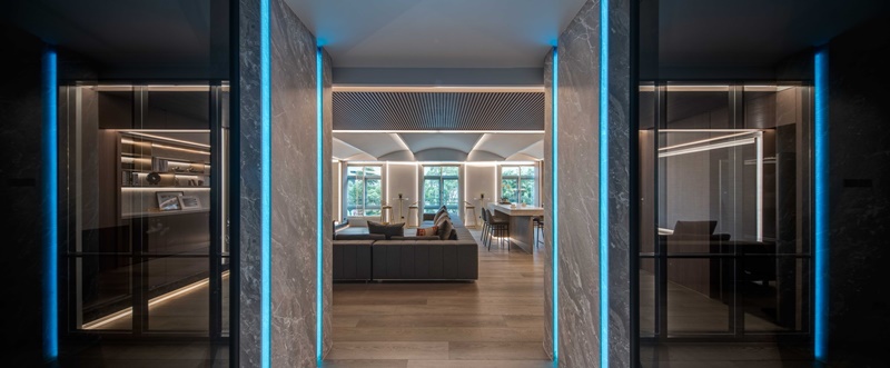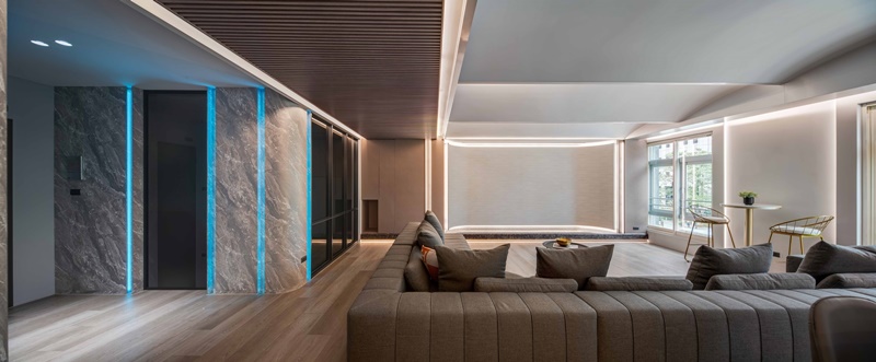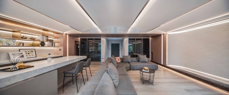 一進到室內,映入眼簾的即是大面積窗景,可引進自然光線、延伸視野。其中,全室配有RGB內嵌式燈條,能依循使用者需求靈活調整光源色彩,創造多變的情境氛圍。而天花板則有導入層層鋪展開來的拱形設計,可為空間增添律動與視覺層次,並消弭樑體的存在感。另外,為滿足日常交流、接待、休憩等多元商務需求,整體是採開放式設計,藉由整合沙發區與吧台區,能增加場域的使用效率和彈性。