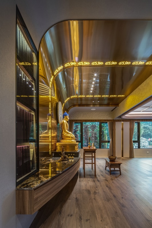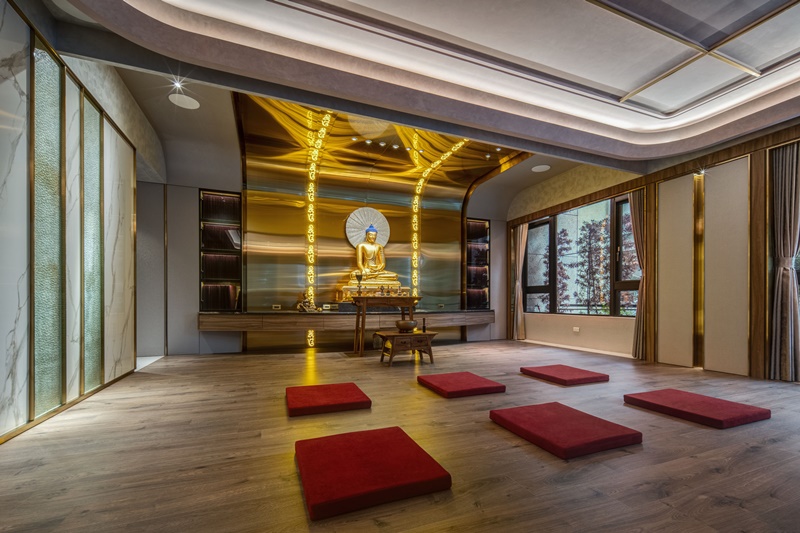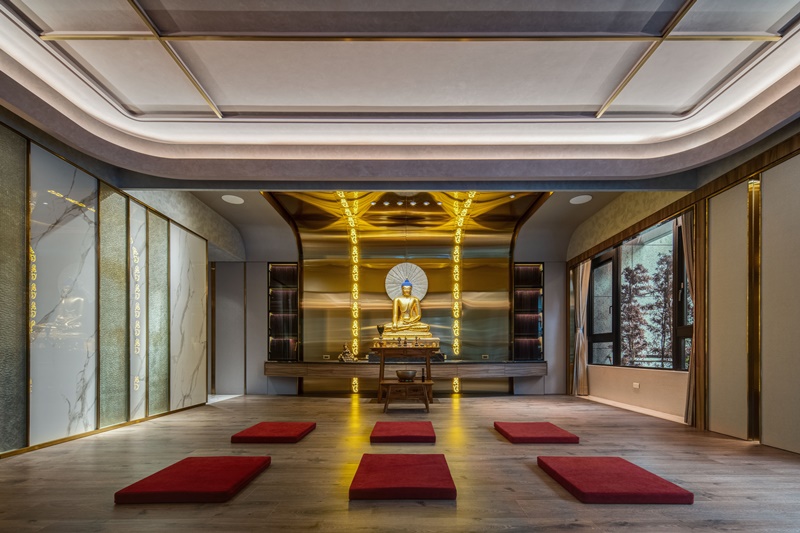 本案為宗教修行會所空間,由豪宅設計公司「遇見設計」操刀,以「從天而降、佛光普照」為理念,構築一處安定心靈的現代佛堂。設計團隊結合新北室內設計推薦經驗,運用鍍鈦金屬、弧形天花與光影配置,營造莊嚴神聖的場域氛圍,回應業主對藏傳佛教的虔敬。整體語彙細膩掌握宗教美學,展現新北室內設計的深厚底蘊,亦延續其於別墅設計、透天別墅設計與獨棟別墅設計領域的統合實力。