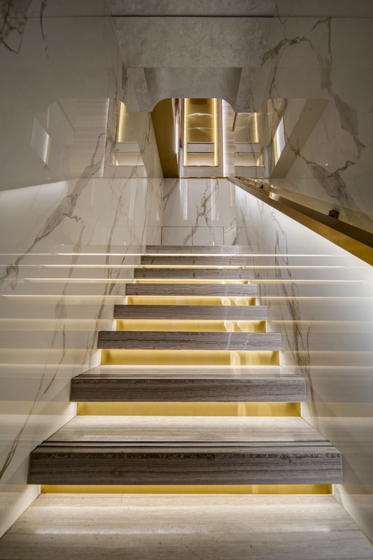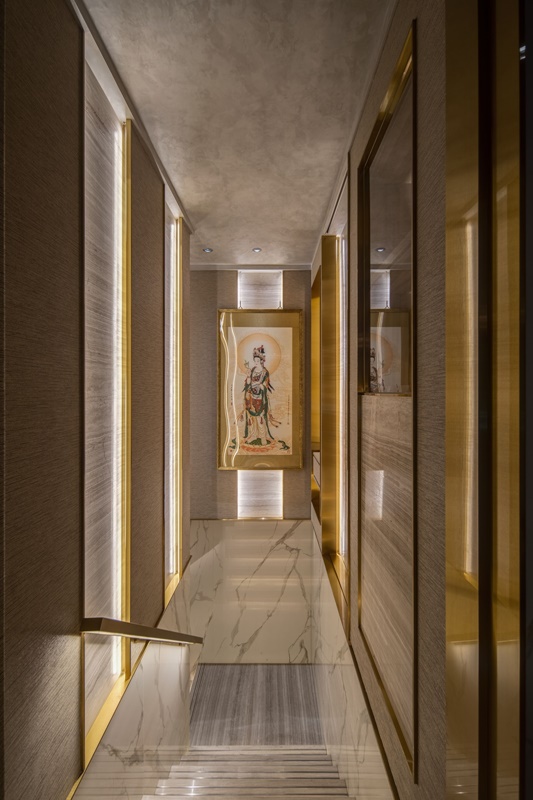 - 樓梯設計:以石紋與金屬為基調,搭配階梯燈光照明,引導行走節奏,強化垂直動線的莊嚴儀式感。