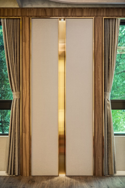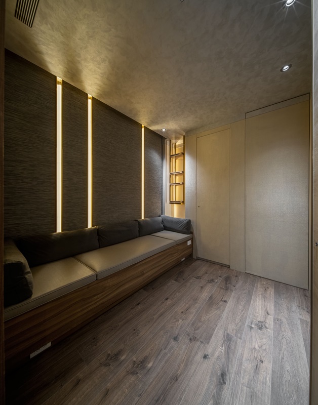 - 質感空間:走道牆面以布紋材、木質收邊與金屬線條勾勒,維持禪意沉靜的過道氛圍。
