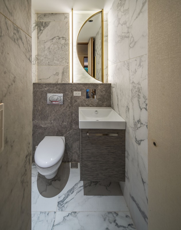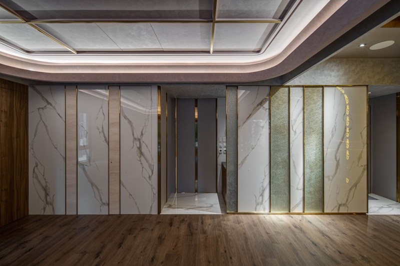 - 材質運用:特殊工法裁切天然石材,轉化為輕盈薄板,於地坪與壁面中保持穩重卻無壓迫。