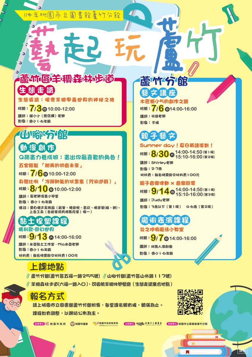 桃園市立圖書館施照輝館長表示,圖書館不只是閱讀的地方,更是陪伴孩子與社區居民一起生活與成長的空間。今年以『藝起玩蘆竹』為主題,課程設計橫跨六大面向,包括生態走讀、藝文展覽講座、親子藝文、魔術表演、動漫創作與捏塑體驗,鼓勵跨齡參與,希望透過藝術、自然與創意,讓大家重新認識生活中處處可見的美好。誠摯邀請您來一起玩蘆竹、玩藝術!