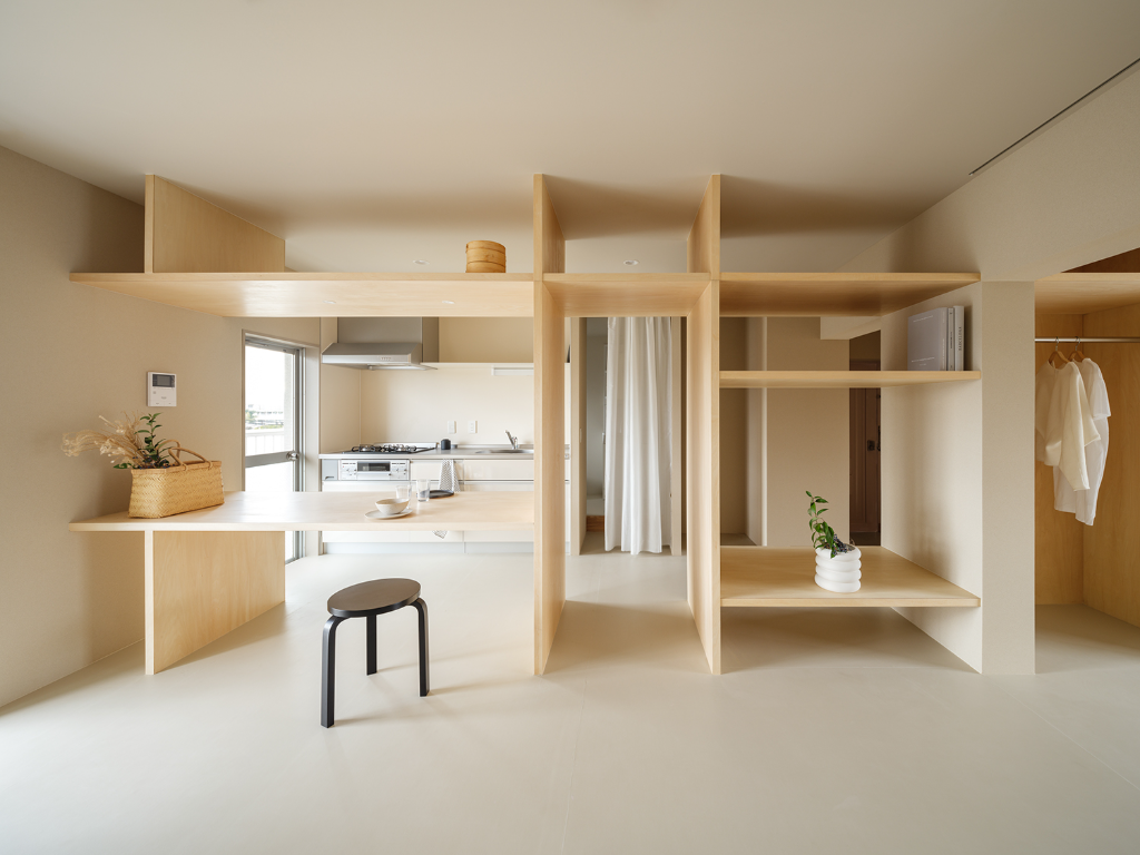 「Nikoichi」計畫由日本的YSLA建築事務所提出,主要目標是希望透過設計改善人們的生活品質,概念是將同一間公寓的兩個單元融合為一個有機體,包含Omoya(母屋)與Hanare(離屋),在日本建築中,Omoya通常被指稱為建築的核心,而在本案中,Omoya則是一個私人空間,規劃為廚房、臥室、餐廳與客廳,由多個隔間組成;至於Hanare在日文中有著「隱藏」的含意,在本案中是一個具備多功能的開闊場域,特意設計九宮格式的大書桌,還有平坦的地板,讓居住者能夠依照個人的喜好自由使用,像是進行運動、繪畫、閱讀、工作等,甚至當成客房,不僅藉此滿足隱私以及與家人情感交流的需求,也充分體現和諧共生的日常價值觀。