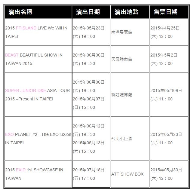 在台灣累積大批粉絲的花美男樂團FTISLAND及唱跳俱佳的男子團體BEAST,每年舉辦巡迴演唱會都必定把台灣列為其中一站。而去年11月底才來辦過演唱會的SUPER JUNIOR,時隔半年派出由東海與銀赫組成的小分隊-SUPER JUNIOR D&E再訪台灣,消息一出令粉絲雀躍不已。以上三個組合的演唱會門票皆於開賣當日售罄,不少BEAST的粉絲甚至表示「天母體育館太小,希望能加場 」!