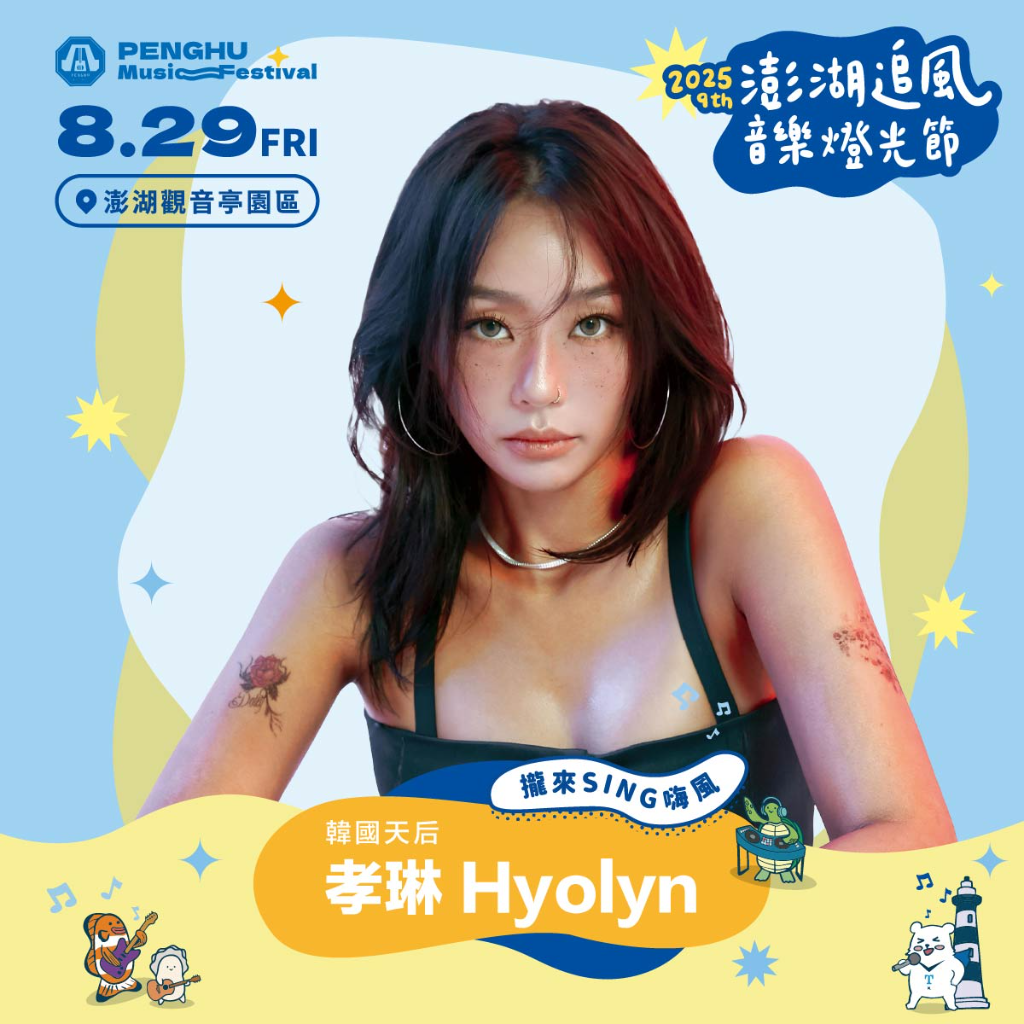 今年最大亮點是首度跨海請來「韓國碧昂絲」之稱的天后孝琳助陣,這是第一次離島活動有重量級國際藝人演出;澎管處還驚喜宣布,今年8月30日加碼一場由許富凱、李子森、陳孟賢及杜忻恬組成的「三王一后」台語經典之夜,華語流行樂壇天王天后天團將在澎湖大拼場,精彩可期。