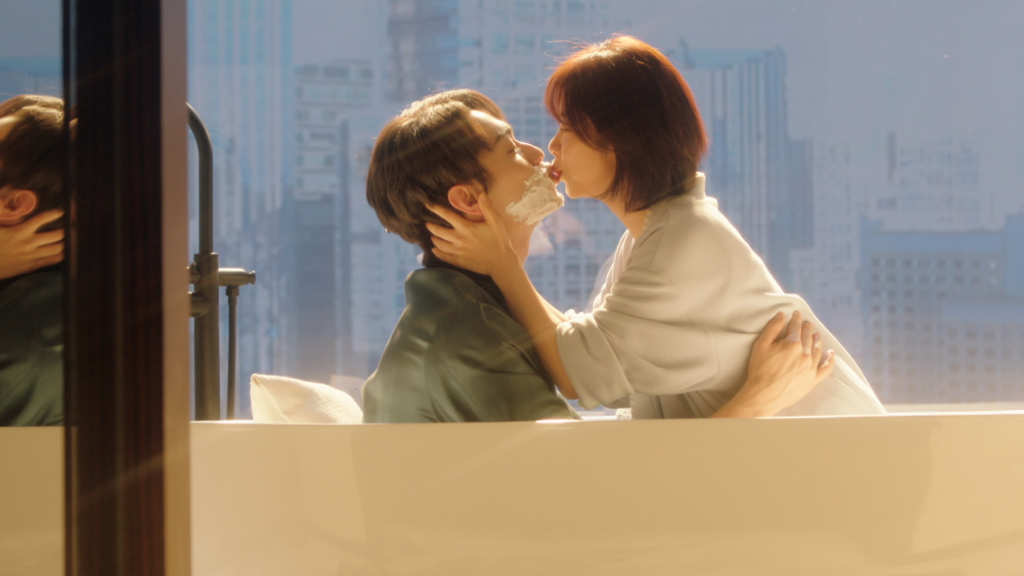▲ 許凱(左起)與譚松韵《你比星光美麗》「刮鬍子之吻」成名場面。(圖:中天娛樂台)