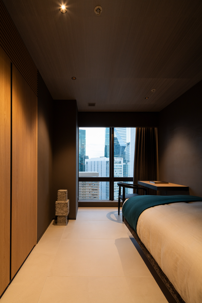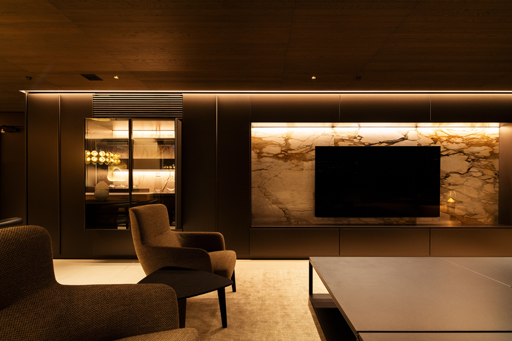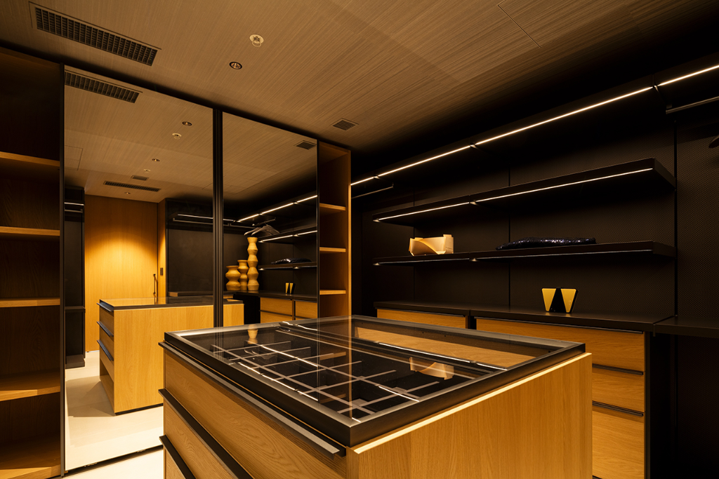 此案位於東京港區赤坂鬧區,為一面積達55坪的高樓層公寓。其中大量選用義大利家具Molteni的產品,該品牌特別以其視覺美感出眾的收納櫃而聞名,尤其是衣櫥。在此項目中,這些收納模組可謂是Molteni品牌的精髓,並被表現為建築的「核心」 —— 它們對於空間的「結構」至關重要。