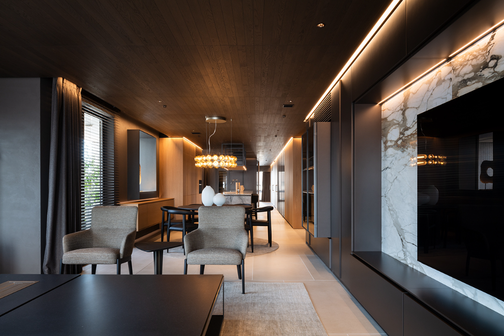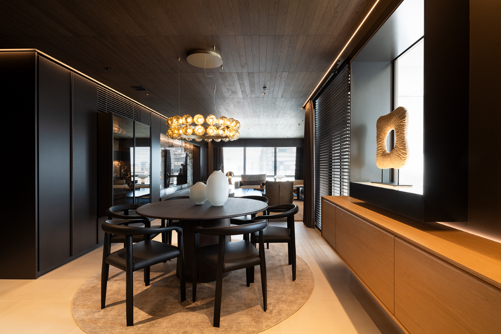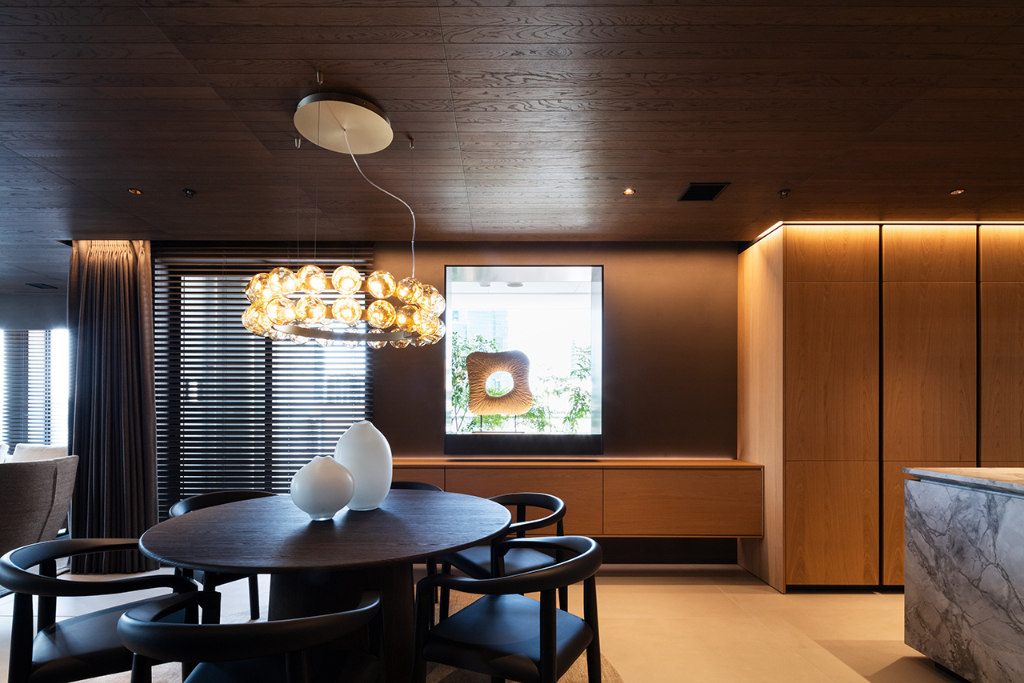 整體從客廳延伸至餐廳和廚房的收納系統無縫排列,營造出一種規律、整齊的感受。在客廳活動時,牆面式的收納櫃可一眼望穿、盡覽所有陳列物品,玻璃反射讓公領域擁有豐厚層次,給人一種異空間意象,讓室內充滿趣味性又帶有戲劇化的視覺效果。