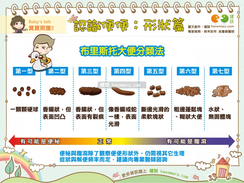 家長可以參考「布里斯托大便分類法」來觀察孩童糞便的外觀形狀:形狀呈顆粒狀且越硬的糞便,就是接近便秘的性狀;而形狀越糊越水的糞便,則是接近腹瀉的性狀。