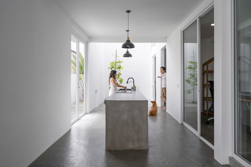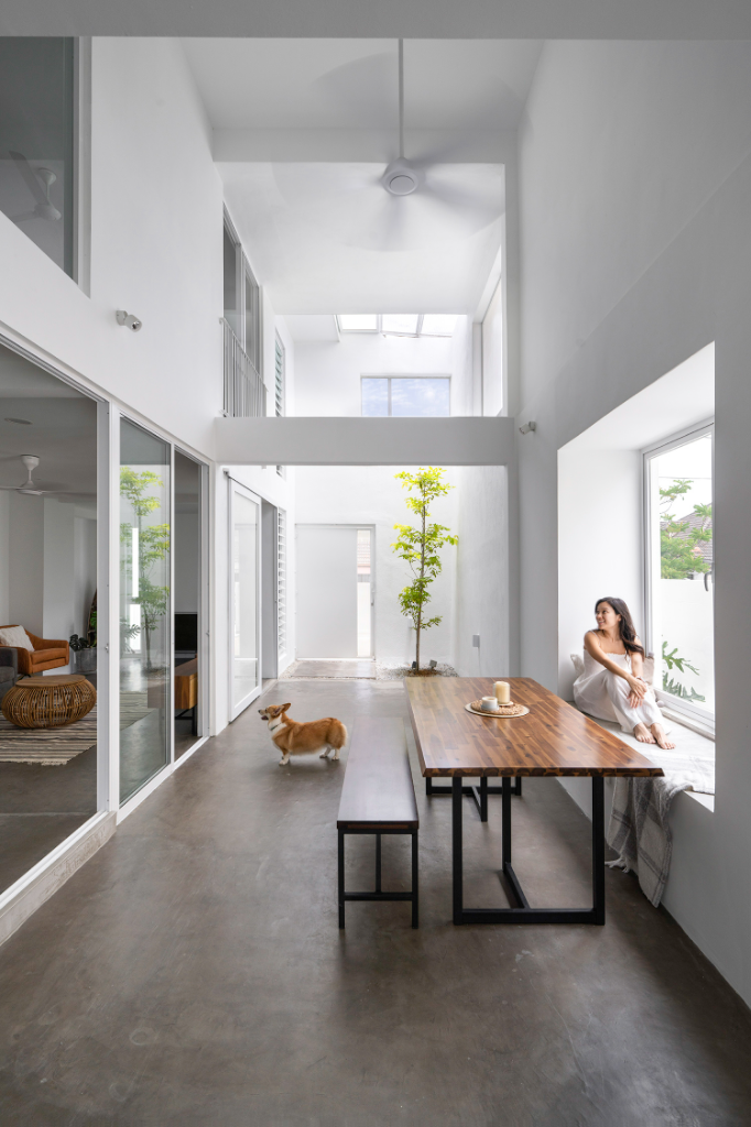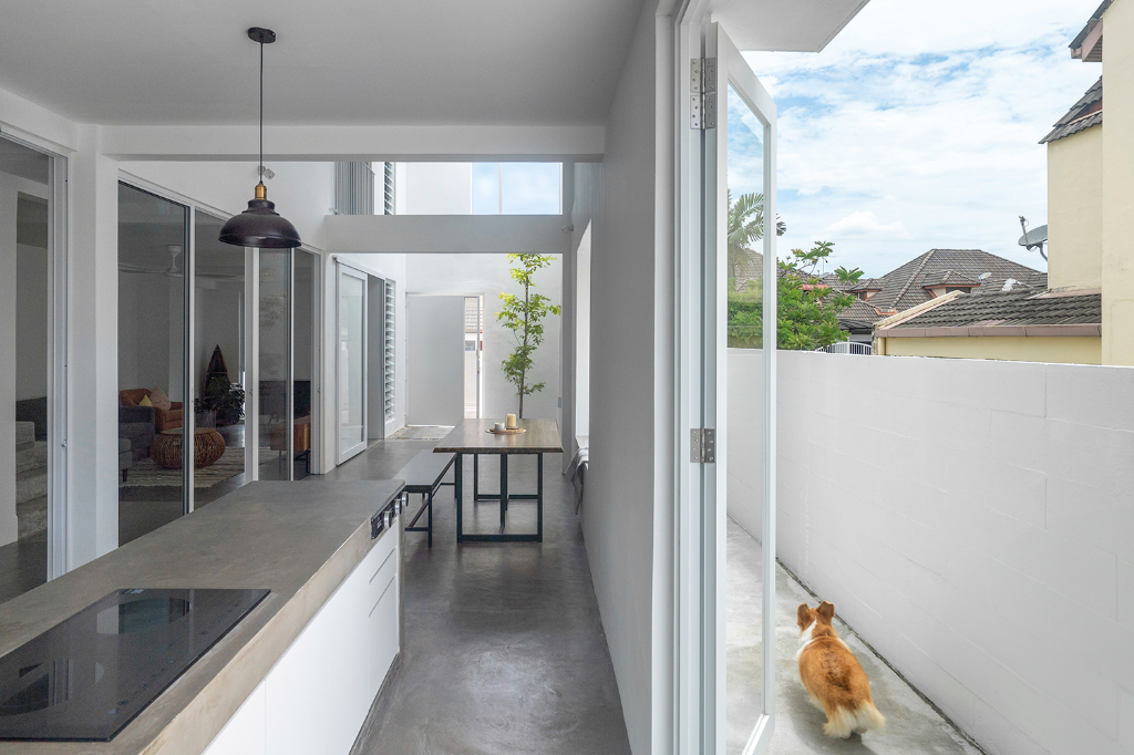 這樣大膽的設計將房屋一分為二,包含室內區塊與室外區塊,兩者形成鮮明對比。室內區塊沿著鄰房一側延伸,包含所有主要居住空間,而每個空間又都藉著玻璃門與室外世界相連,另一側,半露天的雙層區域給人如詩如畫的瑰麗感受,這裡設有開放式廚房、用餐區與兩側的綠意景觀,為了讓自然光與新鮮空氣洋溢其中,因此特別在外牆規劃開口,保持視線通透之餘,也維護了居住者的隱私。