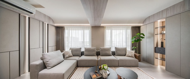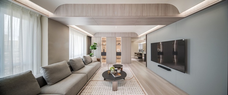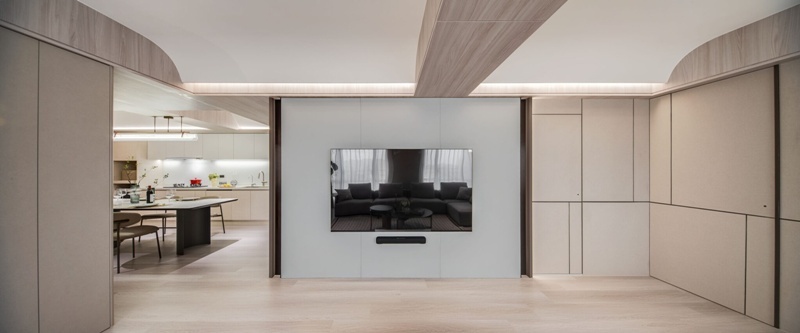 細膩材質與收納細節彼此呼應,於開放通透的空間裡,形塑柔和雅緻的居家氛圍。隱藏式櫃體與圓弧線條相映,創造純淨流暢的視覺節奏,融合永續用材思維,回應當代生活需求,亦呈現宜居且具有格調的現代住宅樣貌。
