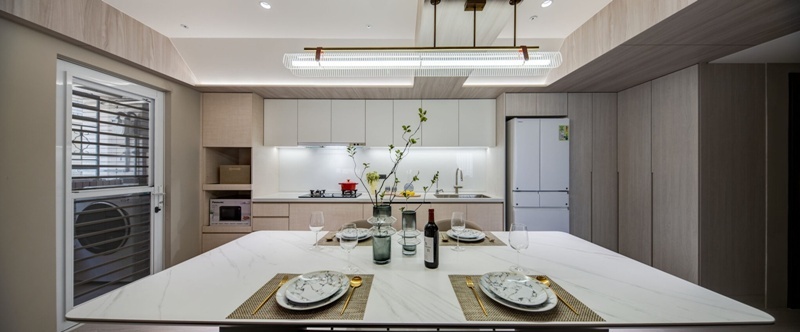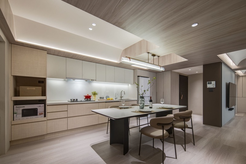 - 開放空間:餐廚區寬敞配置,搭配大餐桌,動線流暢且舒適。