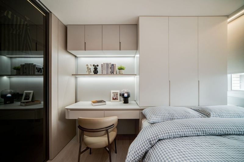 - 無痕收納:全室採隱藏式與按壓式無把手櫃體,營造出整齊純淨的空間氛圍。