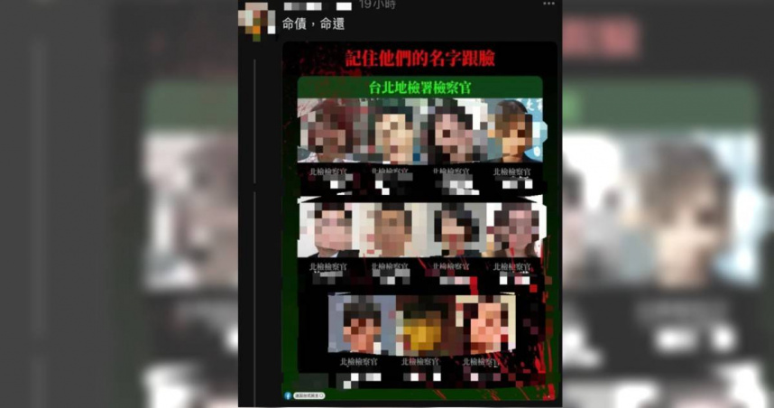 台北市前副市長彭振聲因涉嫌京華城圖利案,日前北上應訊時妻子卻墜樓身亡。對此,「迷因台式民主」粉專版主39歲戴姓工程師在網路散布承辦此案的11名檢察官與3名法官照片、姓名,要大家「記住他們的名字跟臉」,目前已依涉嫌恐嚇遭聲押禁見。之後,台中一名41歲林姓女子在網路轉發該圖,還加上「命債命還」等字眼,警方於3日晚間逮捕林女與41歲的周姓男友,將2人移送北市刑大偵訊,將進一步釐清案情。