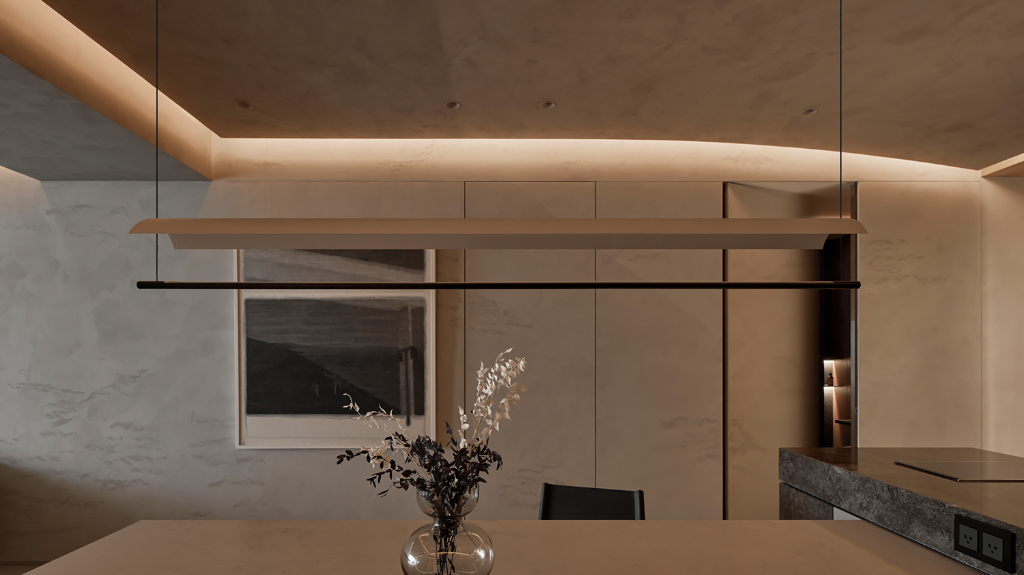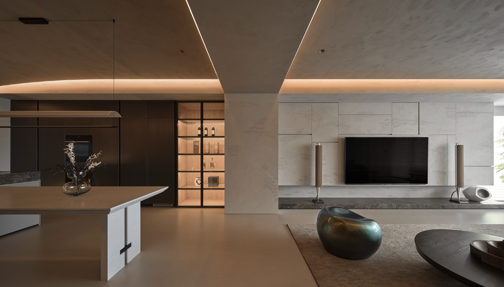 面對客餐廳之間橫亙的大梁,設計師藉由略微降低的天花配合弧形線條,巧妙消解視覺斷裂感。並於天花置入變色燈條以串聯兩區光影層次,使該區角色能隨場合靈活轉換,無論是品酒時刻或家庭聚會,都能享有理想氛圍。並且調整後挑高後的天花也釋放出額外空間,可隱藏冷氣與照明系統,進而強調機能與美學的統一。