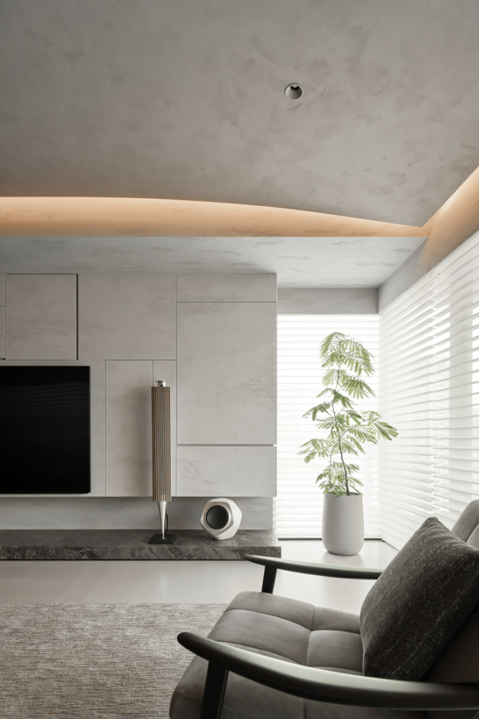 客廳中,一組精緻的B&O音響成為設計靈感的起點。沙發擺放位置經過縝密計算,在此可遠眺台北101,讓城市地標成為日常風景的一部分。電視牆透過嚴謹比例與流暢線條完美融入空間,內藏機櫃與音響設備,外觀線條簡約,比例精準,在開闔操作與尺寸上具備滿滿實用性。