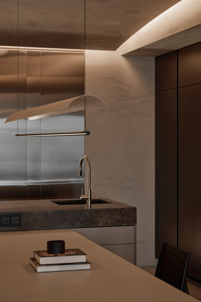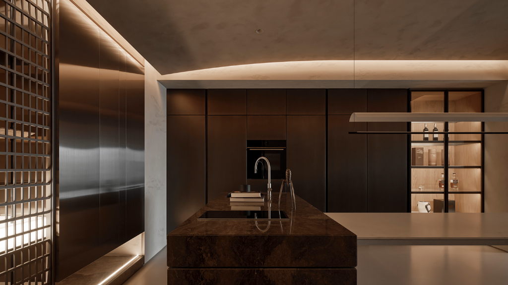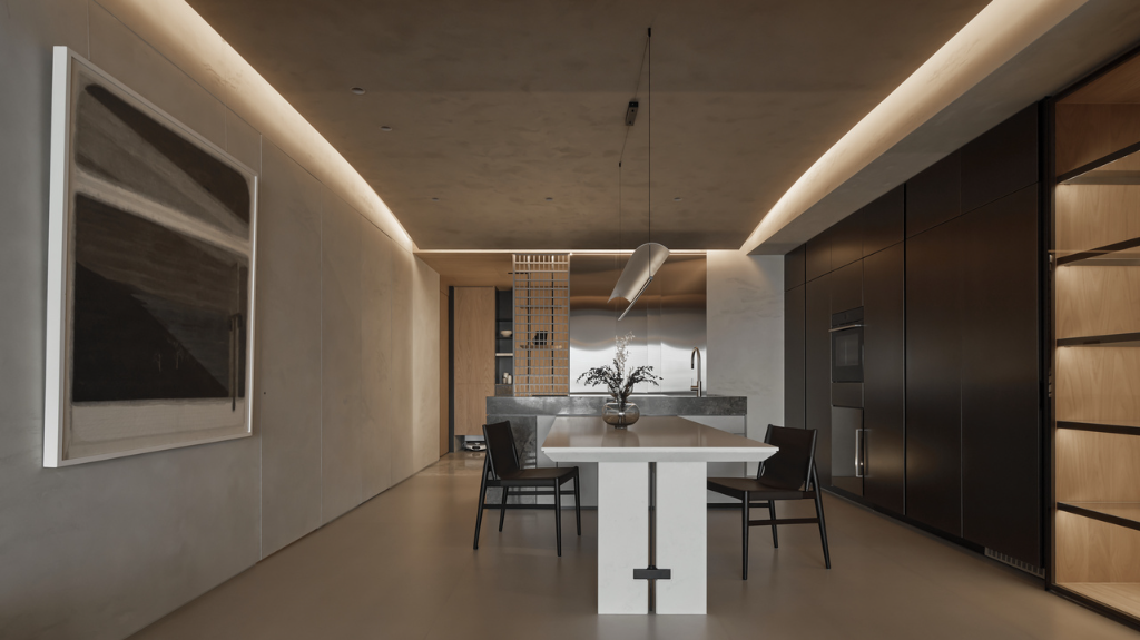 此外,回應屋主期望在簡約基調中注入奢華的期待,設計師以細膩選材貫穿全室:玄關區鍍鈦金屬延伸至起居室的特殊塗料,再至石材的精準點綴。色調方面以米、棕、咖啡色交錯組合,金屬表面的反射為室內增添低調光澤,形塑沉穩大氣的空間表情。餐廚區側開式櫃體儲備生活用品,維持整體環境質感同時提升收納彈性。中島採用咖啡色國畫石,石紋猶如潑墨山水;餐桌選用耐刮人造石,兼顧平日所需與勾勒獨特質感。