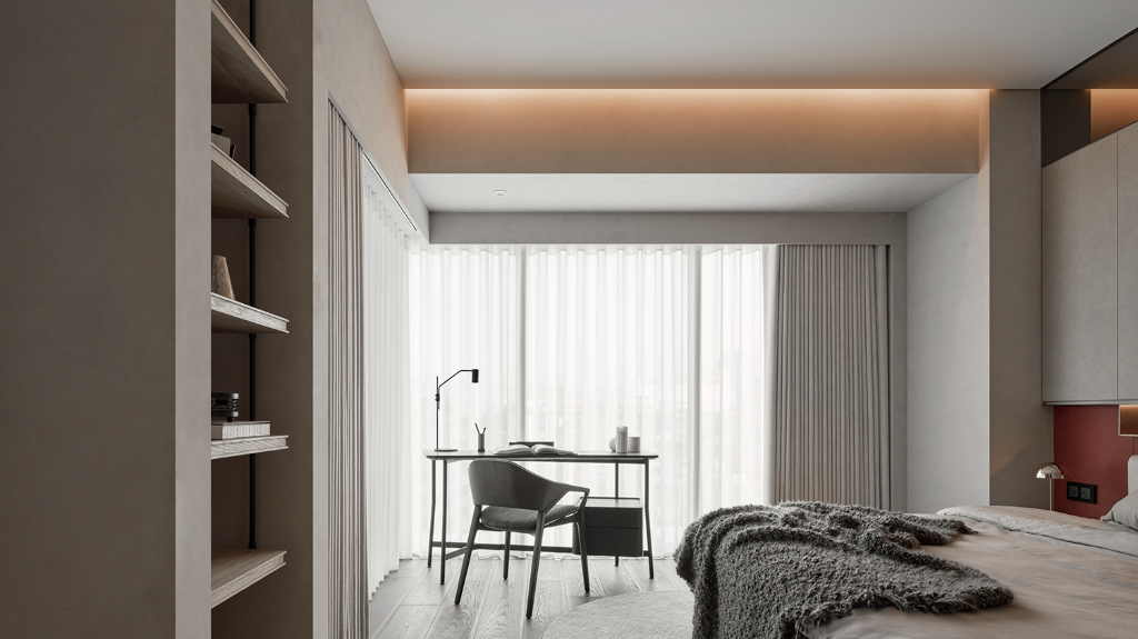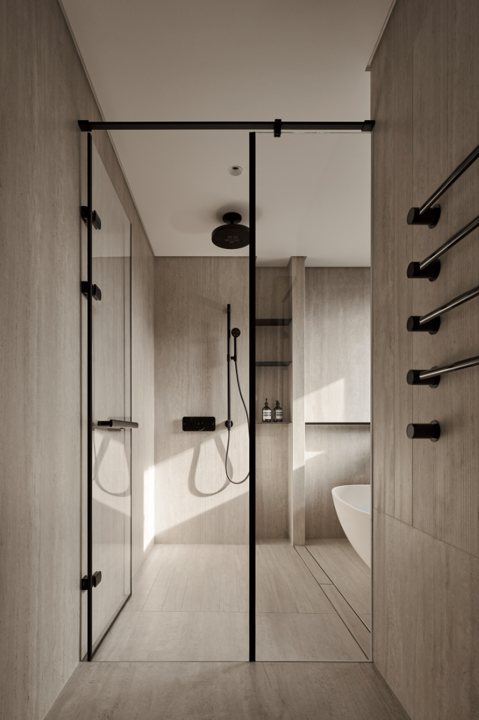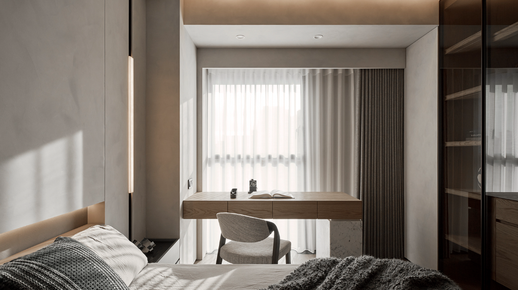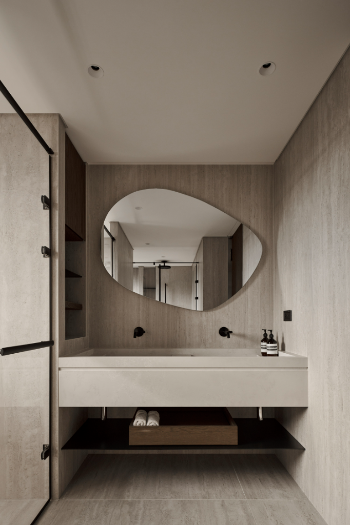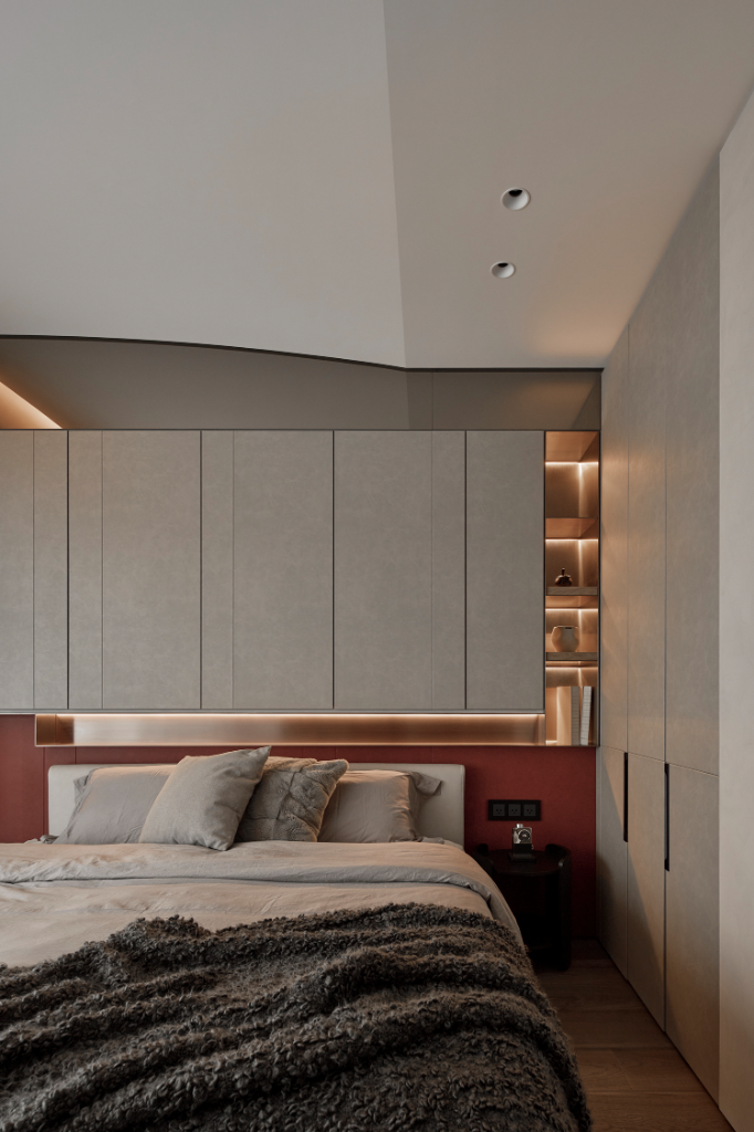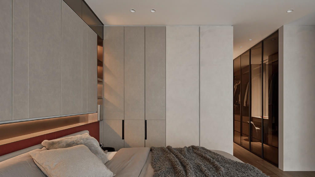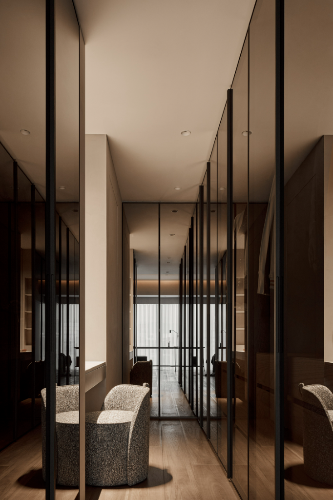另一方面,公領域設計語彙悄然延伸至臥室與更衣室,氛圍轉為柔和包覆。皮革櫃門與床頭背板為室內注入溫潤觸感,鏡面床頭板則擴展空間感,讓視覺深度自然流動。更衣室以鋁框玻璃門在狹長格局中打造通透感,於細節中展現設計的理性與感性。